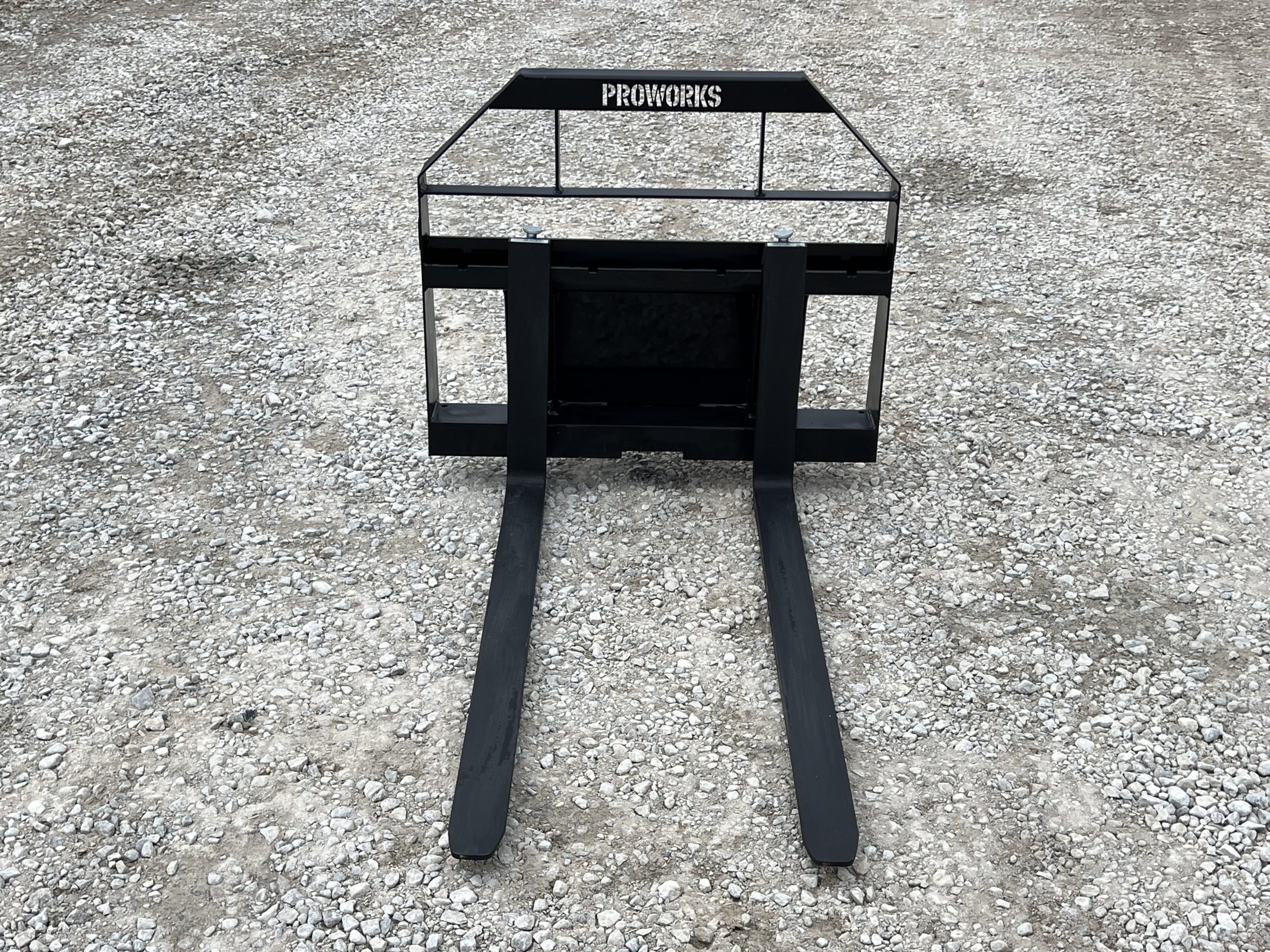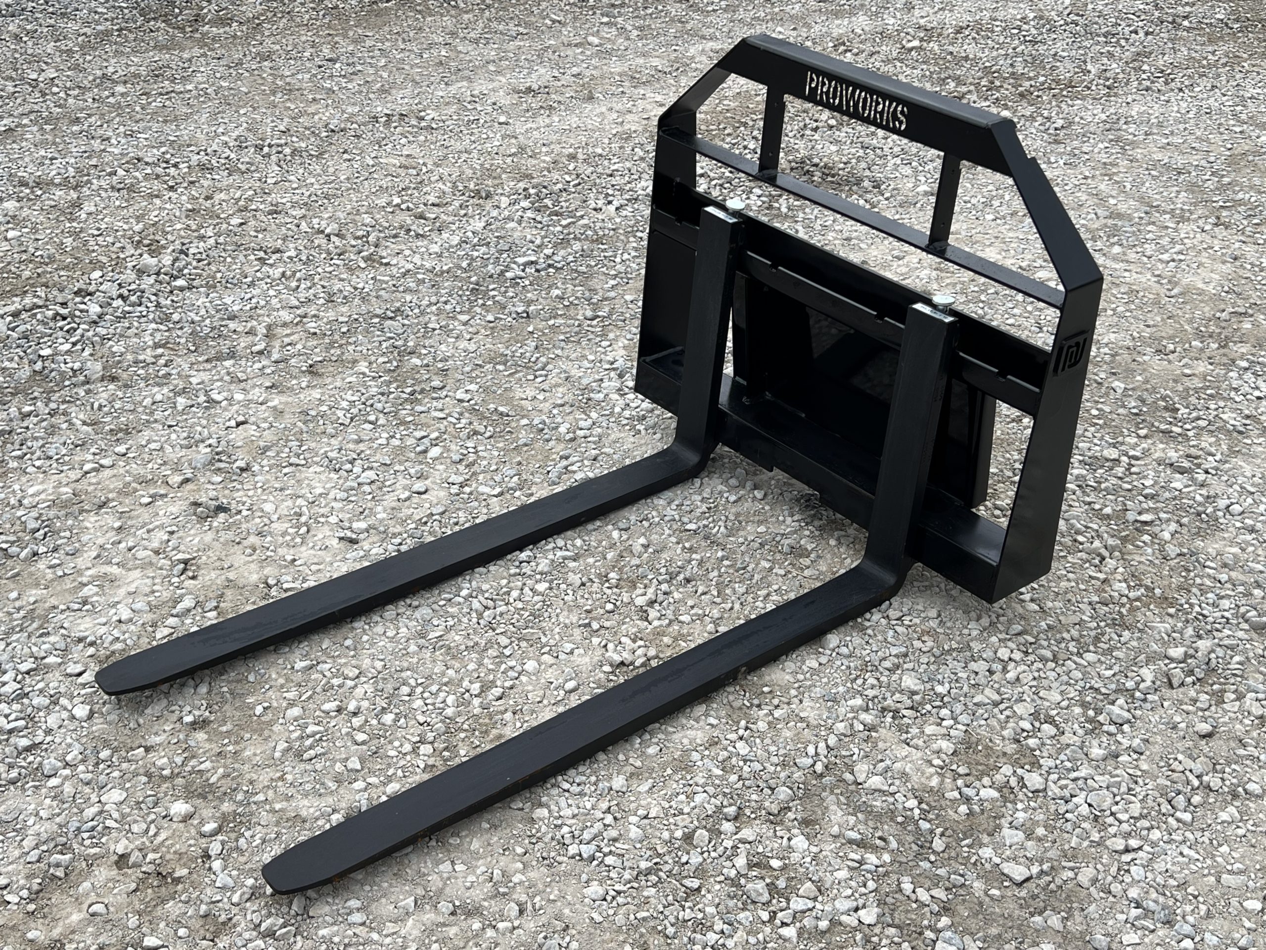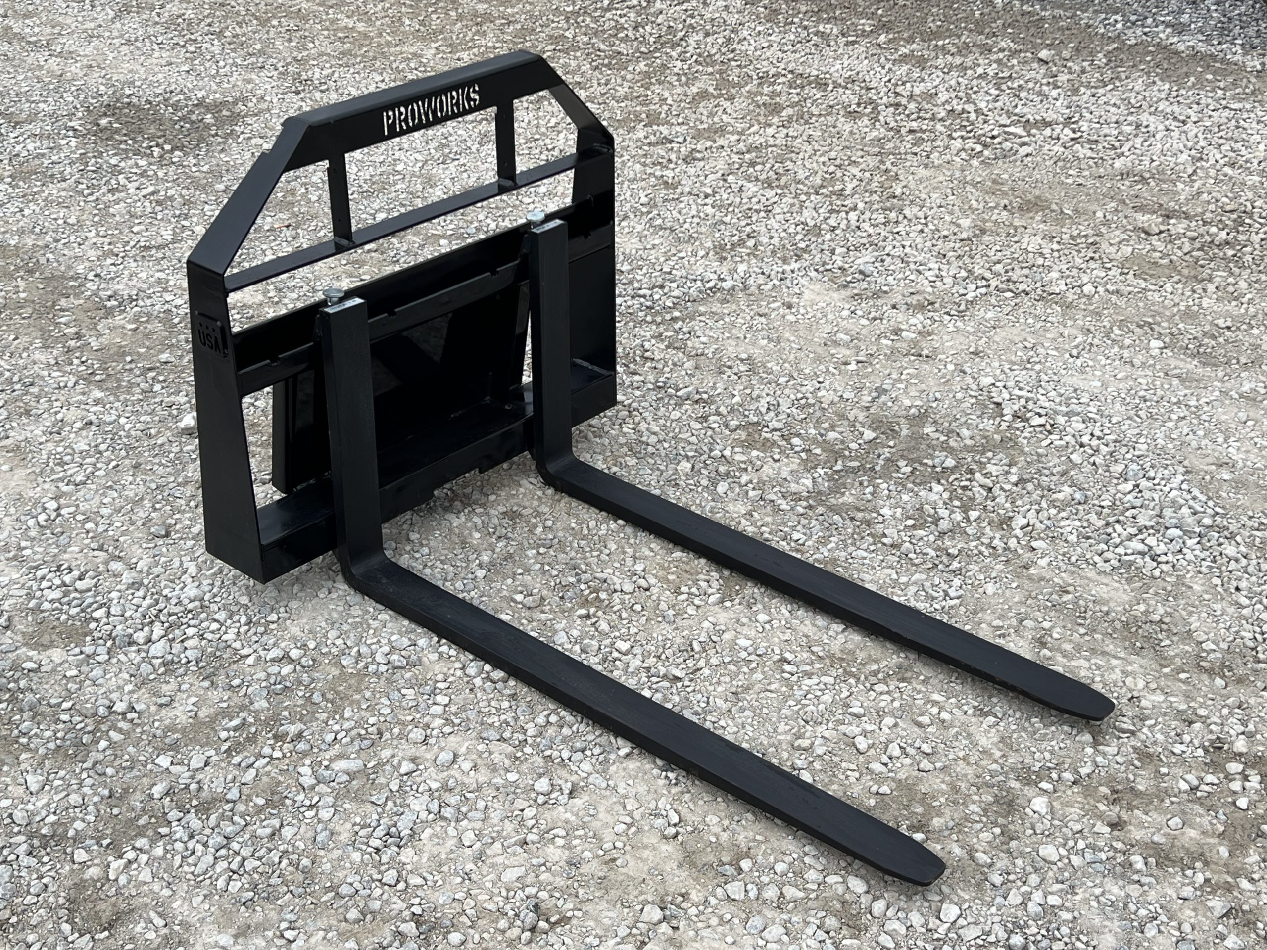 This is a brand new set of PROWORKS heavy duty 48″ pallet forks designed for mini skid steer wheel and compact track loaders. With a 2,200 lb rated capacity, this attachment easily converts your mini skid steer into a compact forklift for handling pallets, lumber, building materials, and more.
