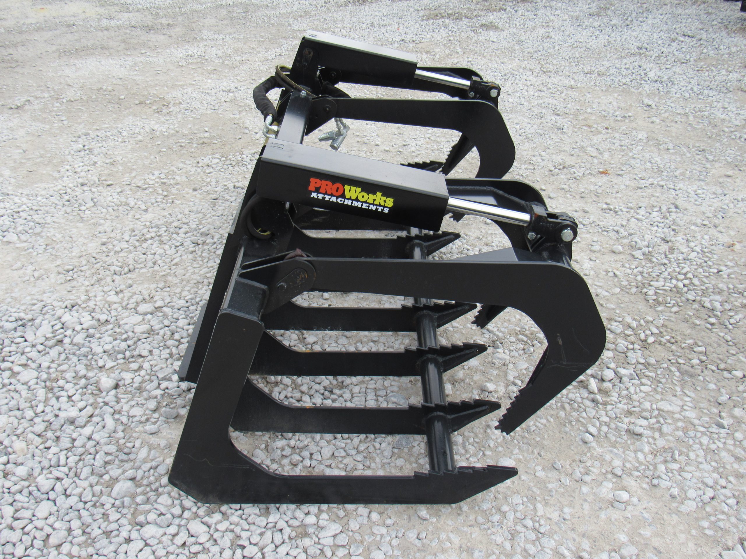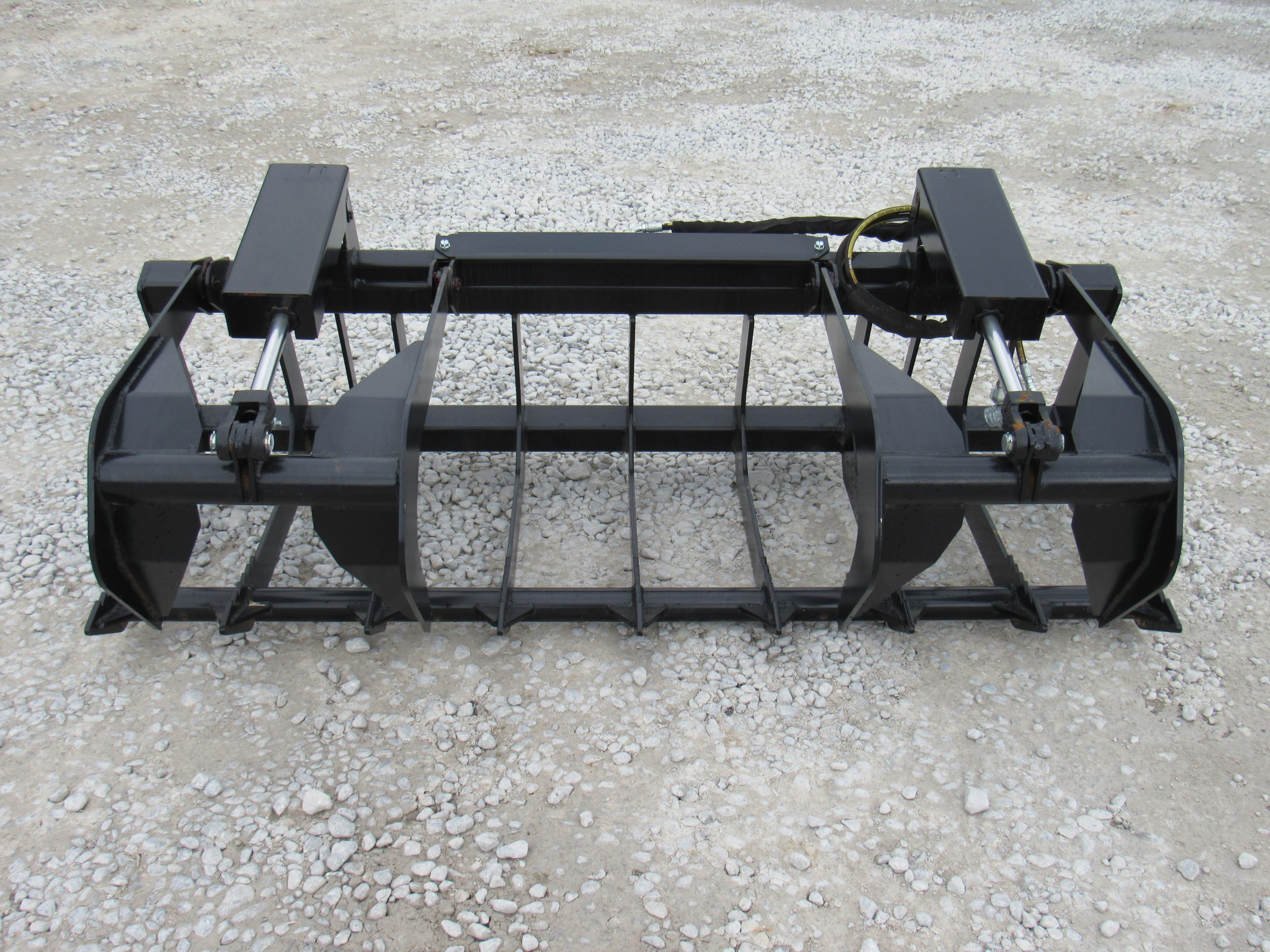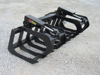 This is a brand new 66″ wide dual cylinder root grapple attachment with the skid steer style quick attach mounting system. This grapple model comes with grease fittings. With two independent grapple tines, you are able to grapple uneven loads. The open bottom design allows for dirt and smaller material to fall through. This model is rated for tractors and skid loaders with less than 45 horsepower.