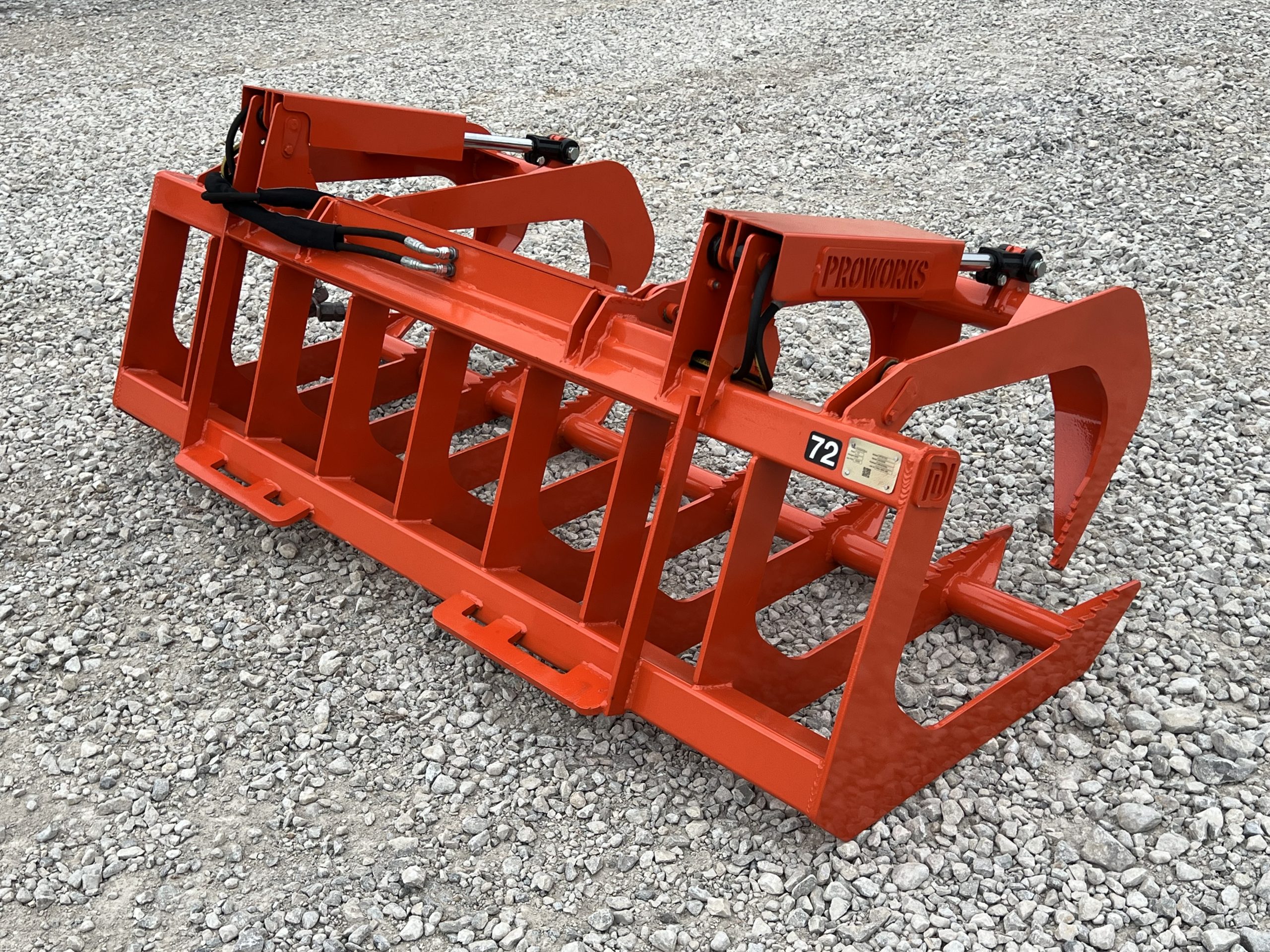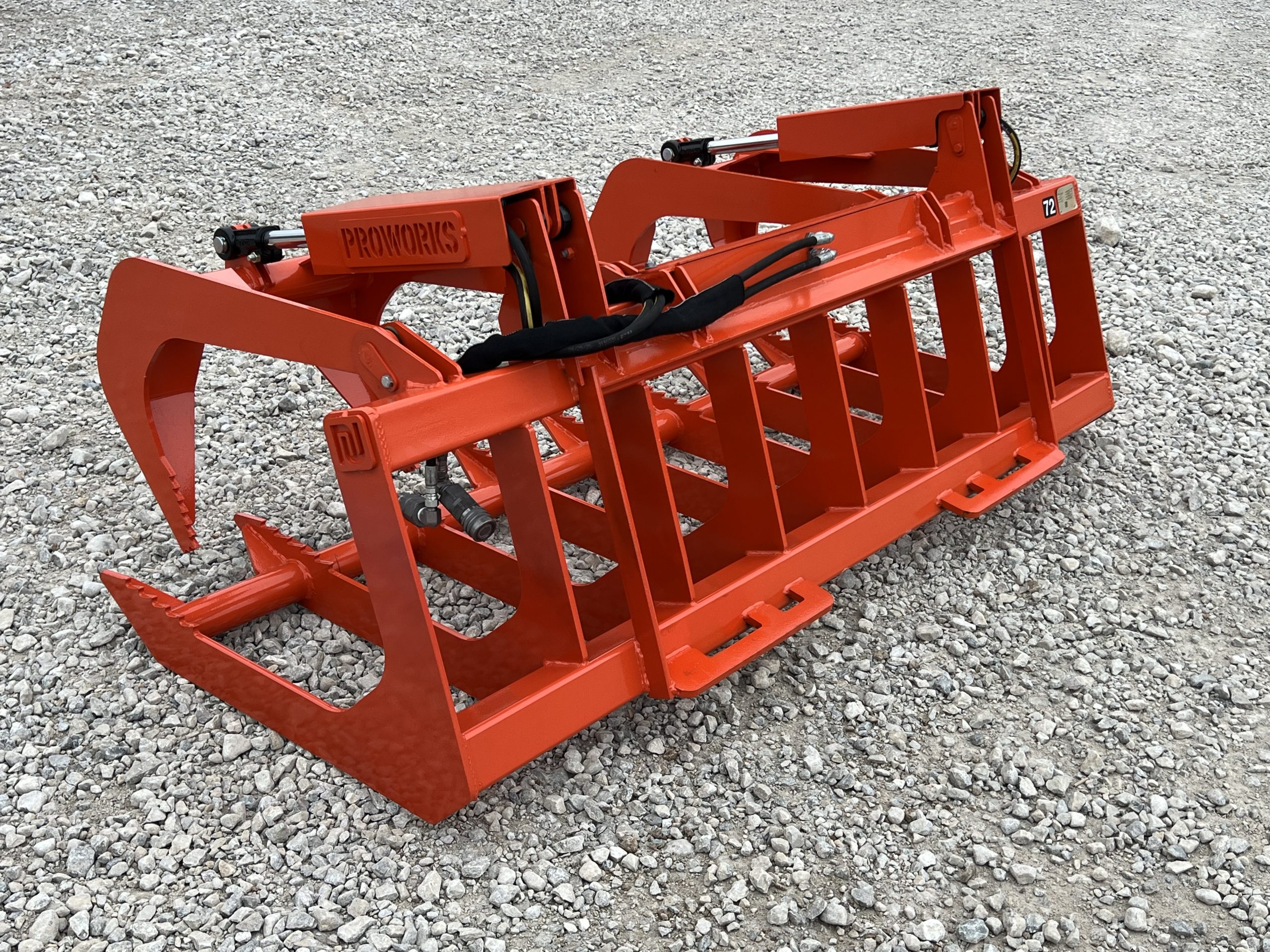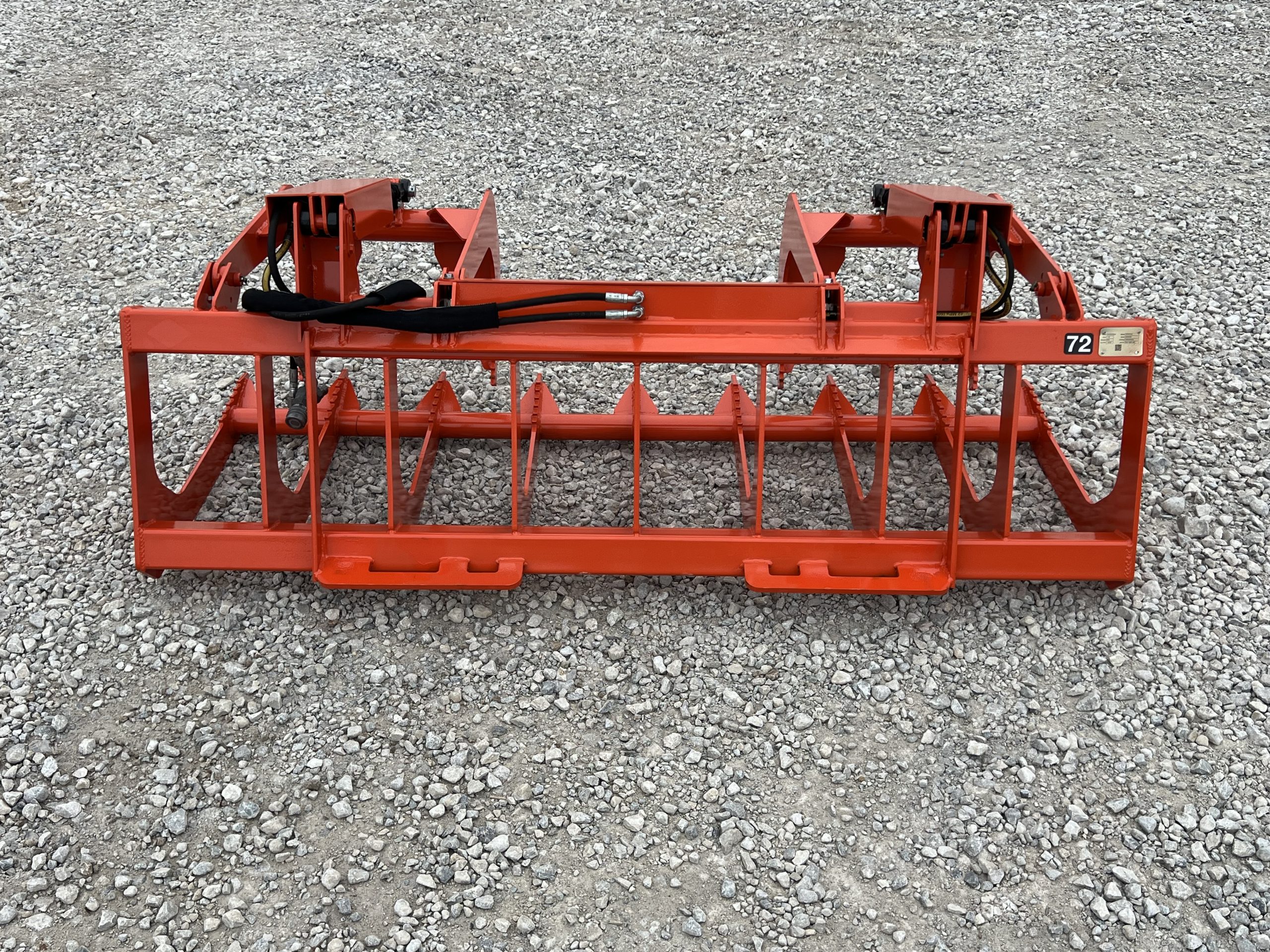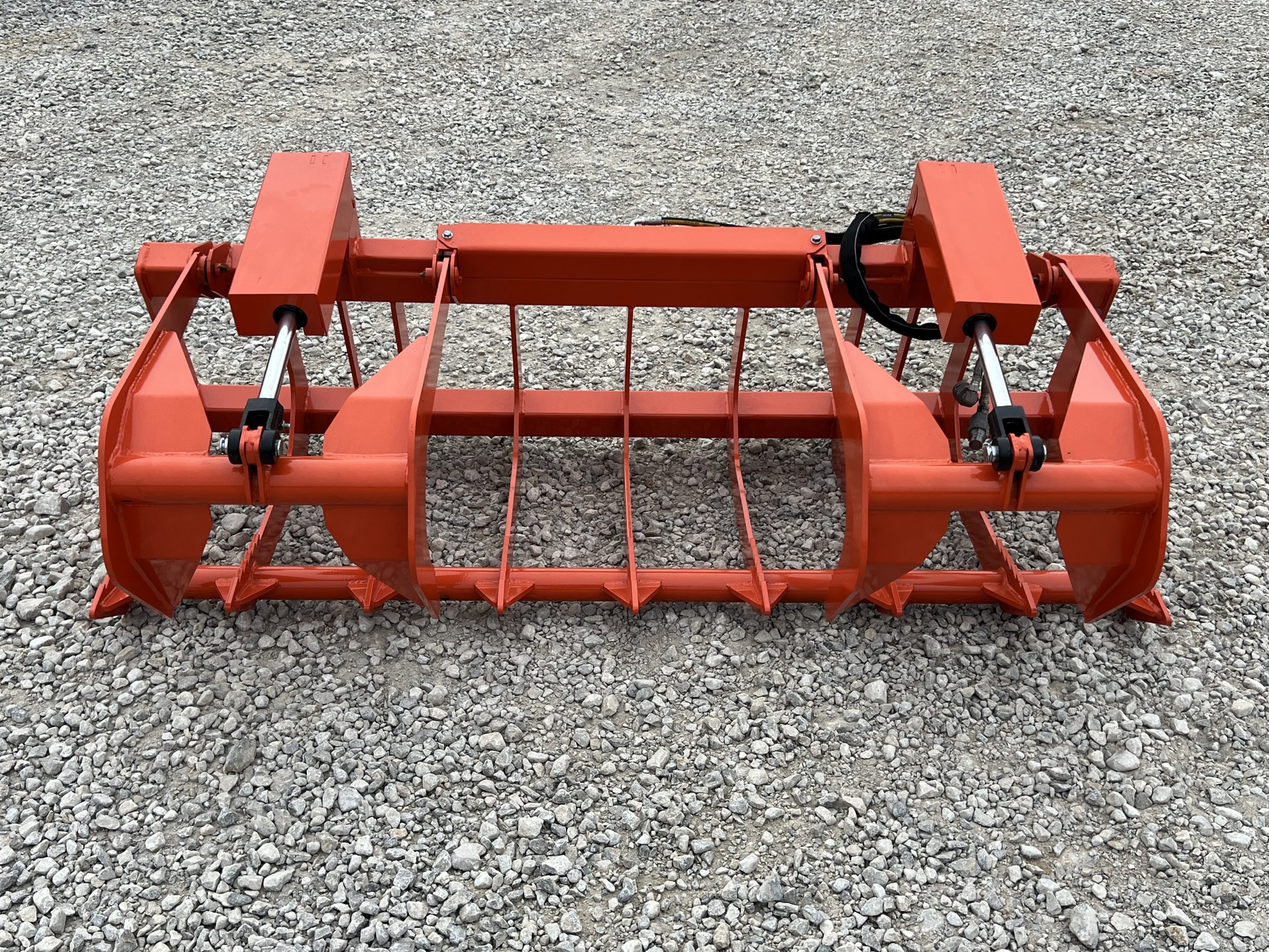 This is a brand new 72″ wide dual cylinder root grapple attachment with the skid steer style quick attach mounting system. This grapple model comes with grease fittings. With two independent grapple tines, you are able to grapple uneven loads. The open bottom design allows for dirt and smaller material to fall through. This model is rated for tractors and skid loaders with less than 45 horsepower.