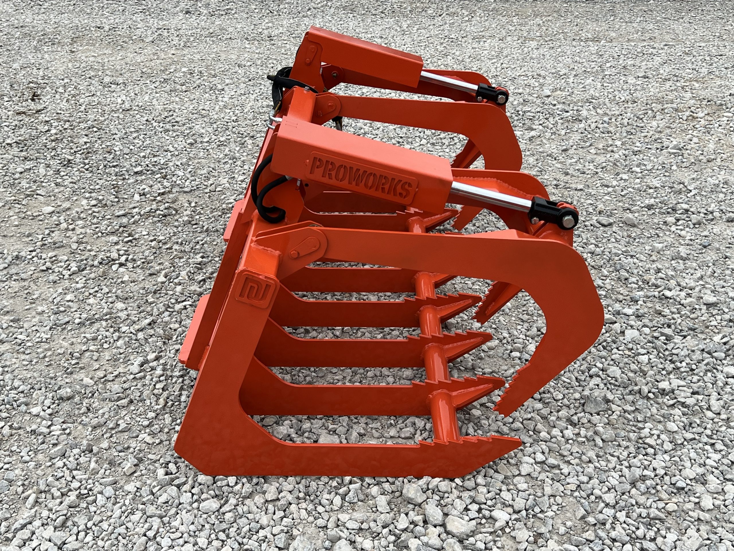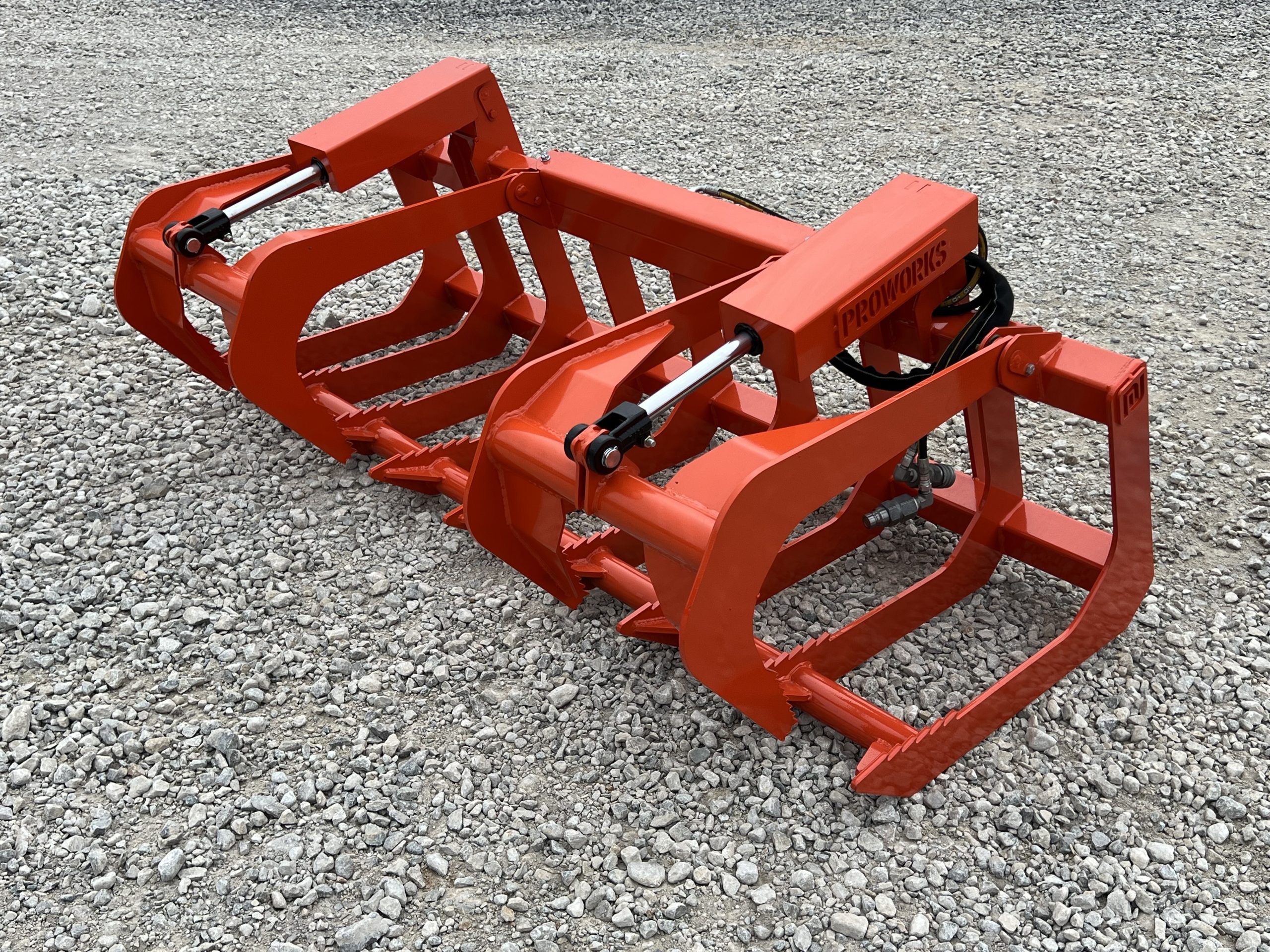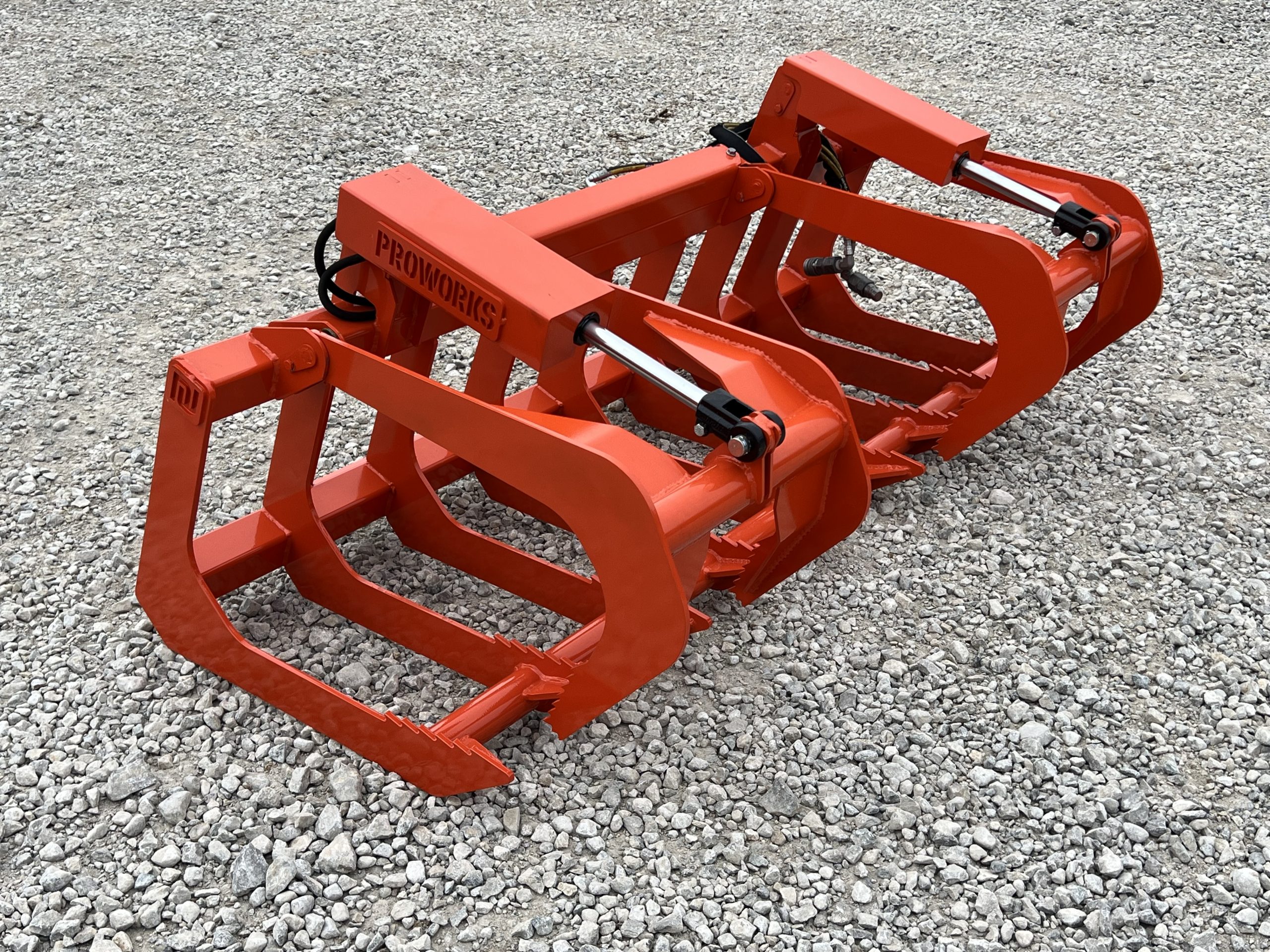 This is a brand new 72″ wide dual cylinder root grapple attachment with the skid steer style quick attach mounting system. This grapple model comes with grease fittings. With two independent grapple tines, you are able to grapple uneven loads. The open bottom design allows for dirt and smaller material to fall through. This model is rated for tractors and skid loaders with less than 45 horsepower.