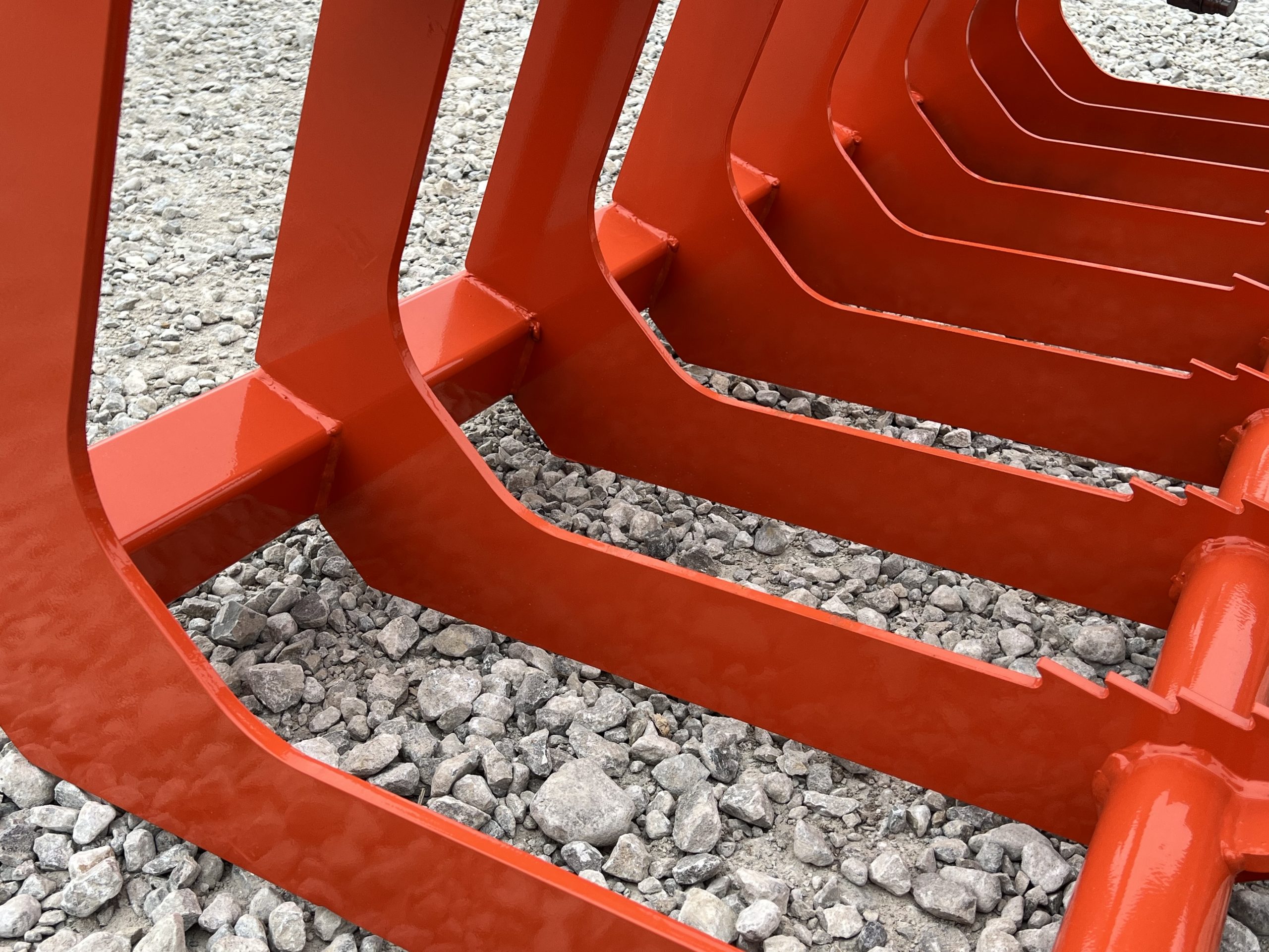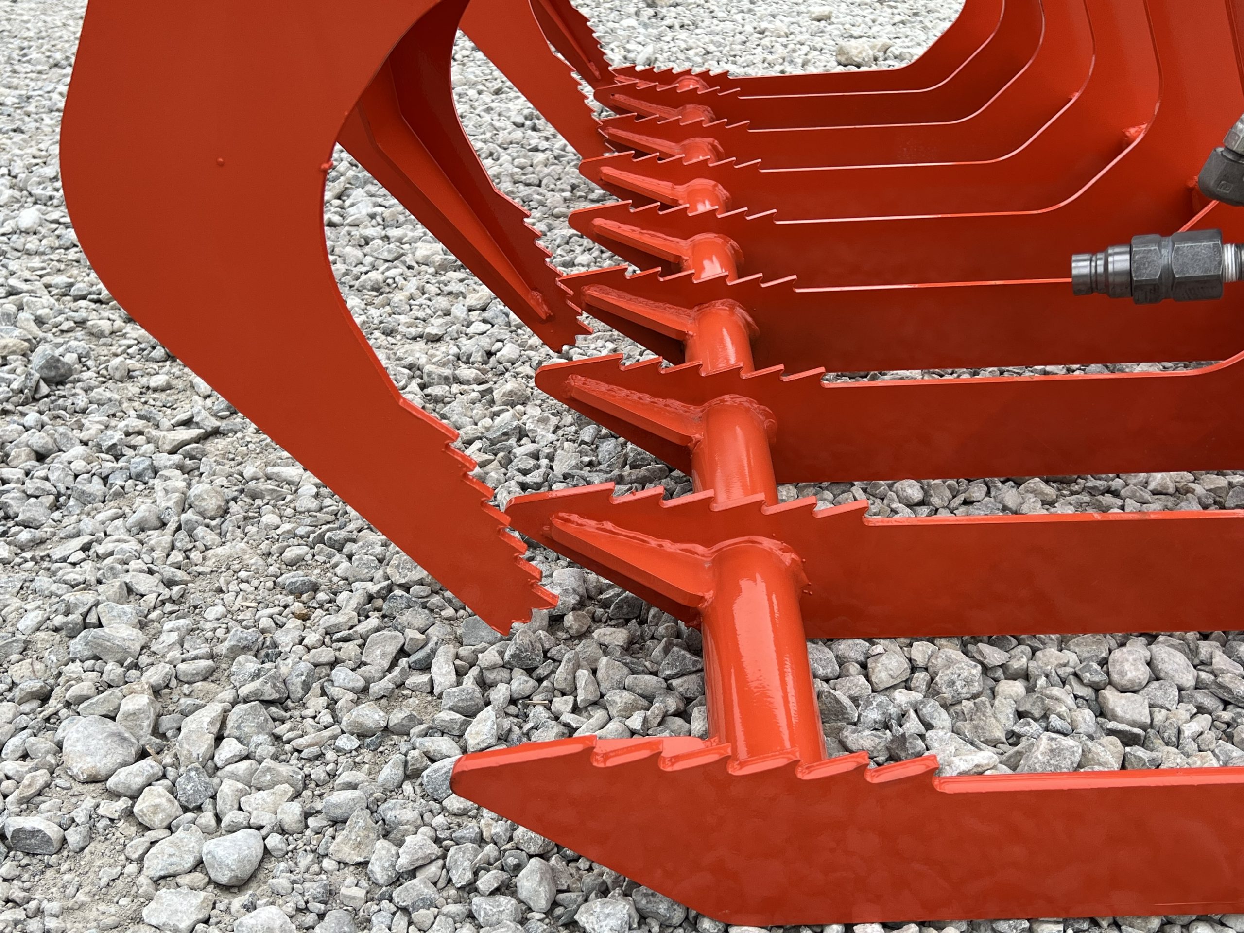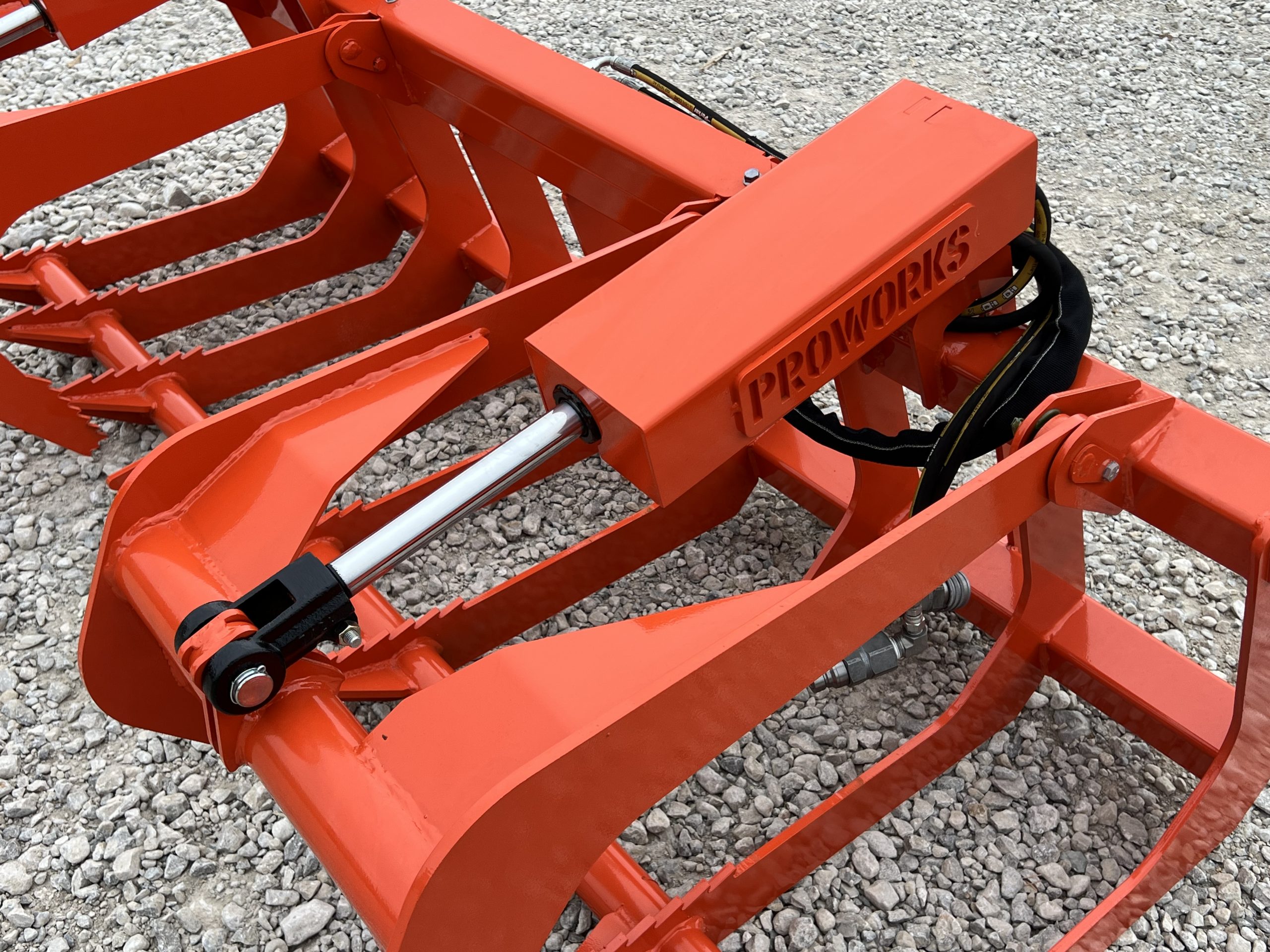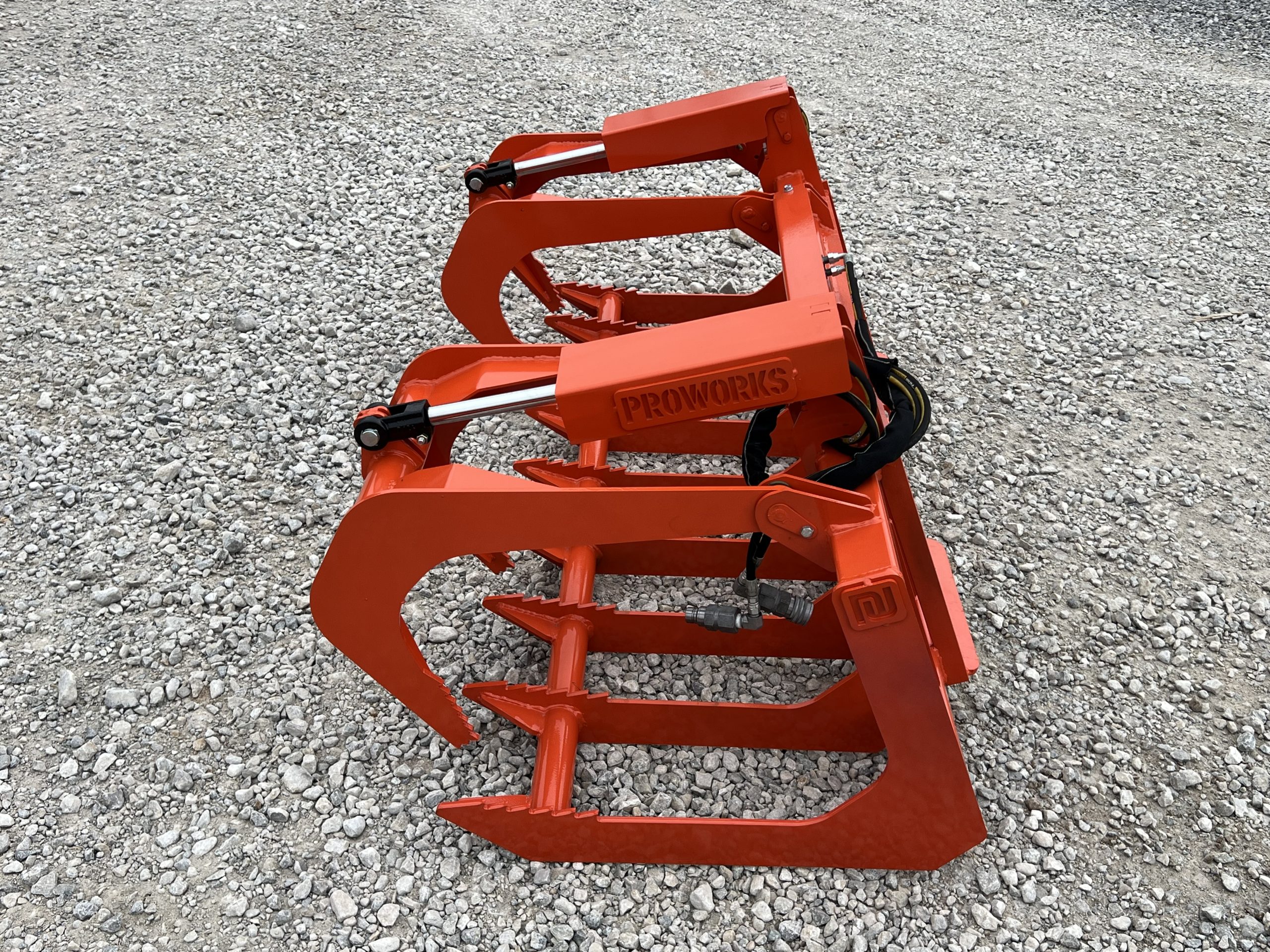 This is a brand new 72″ wide dual cylinder root grapple attachment with the skid steer style quick attach mounting system. This grapple model comes with grease fittings. With two independent grapple tines, you are able to grapple uneven loads. The open bottom design allows for dirt and smaller material to fall through. This model is rated for tractors and skid loaders with less than 45 horsepower.