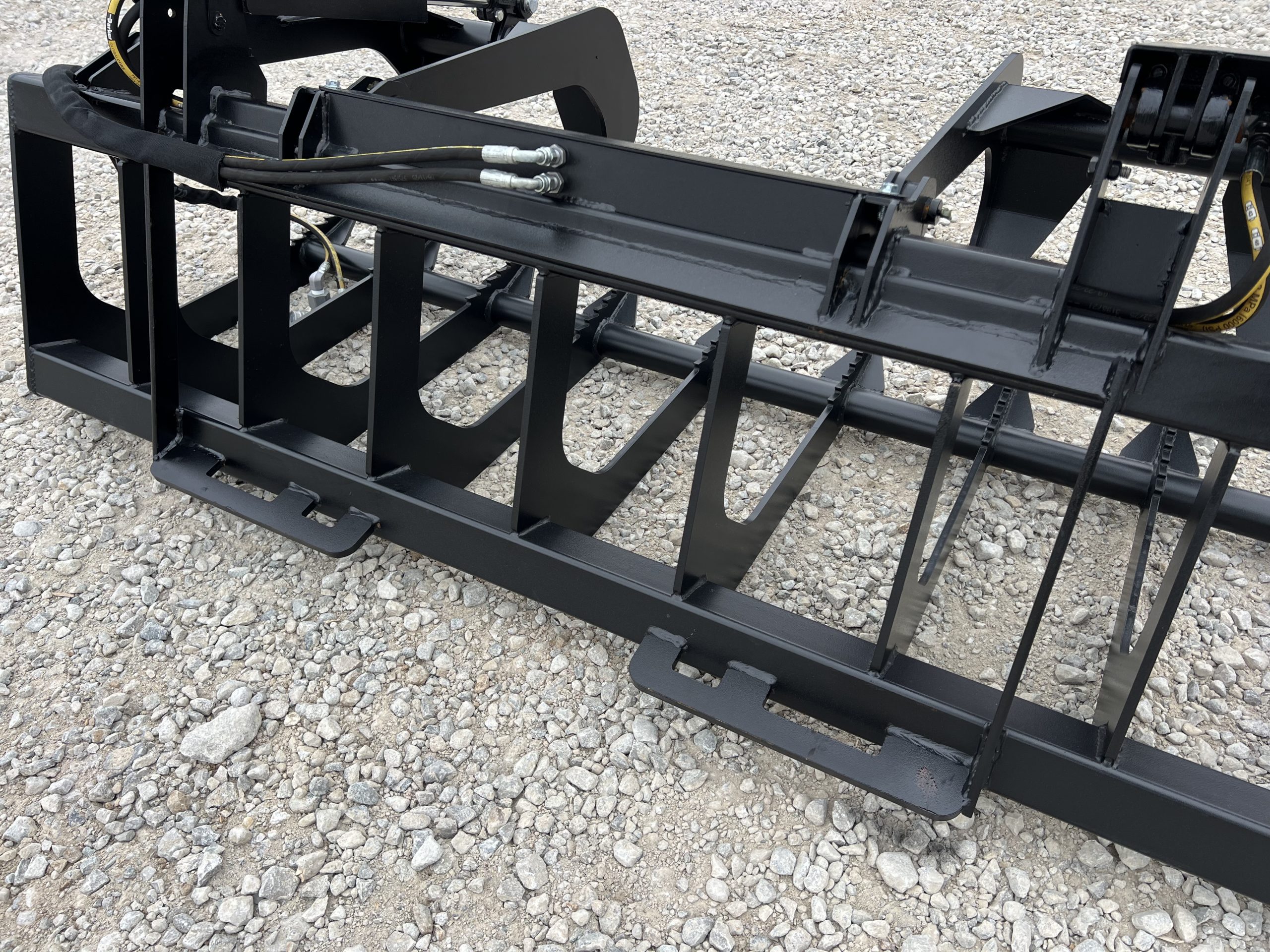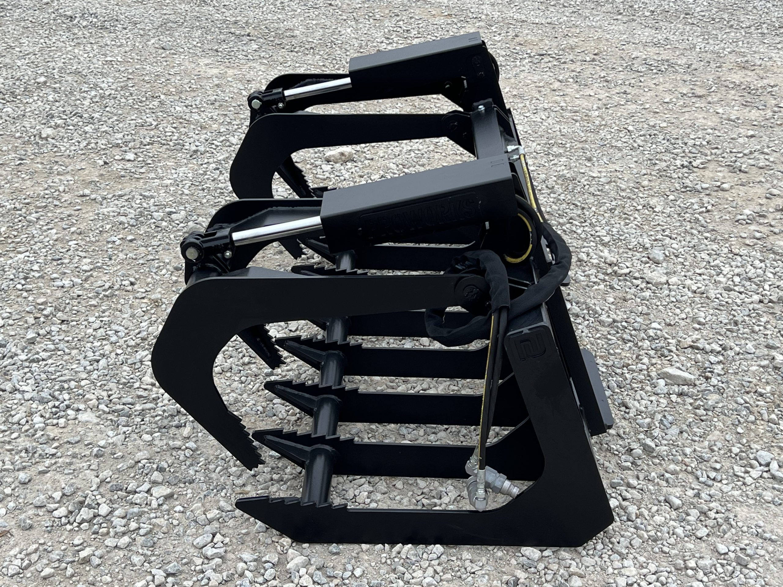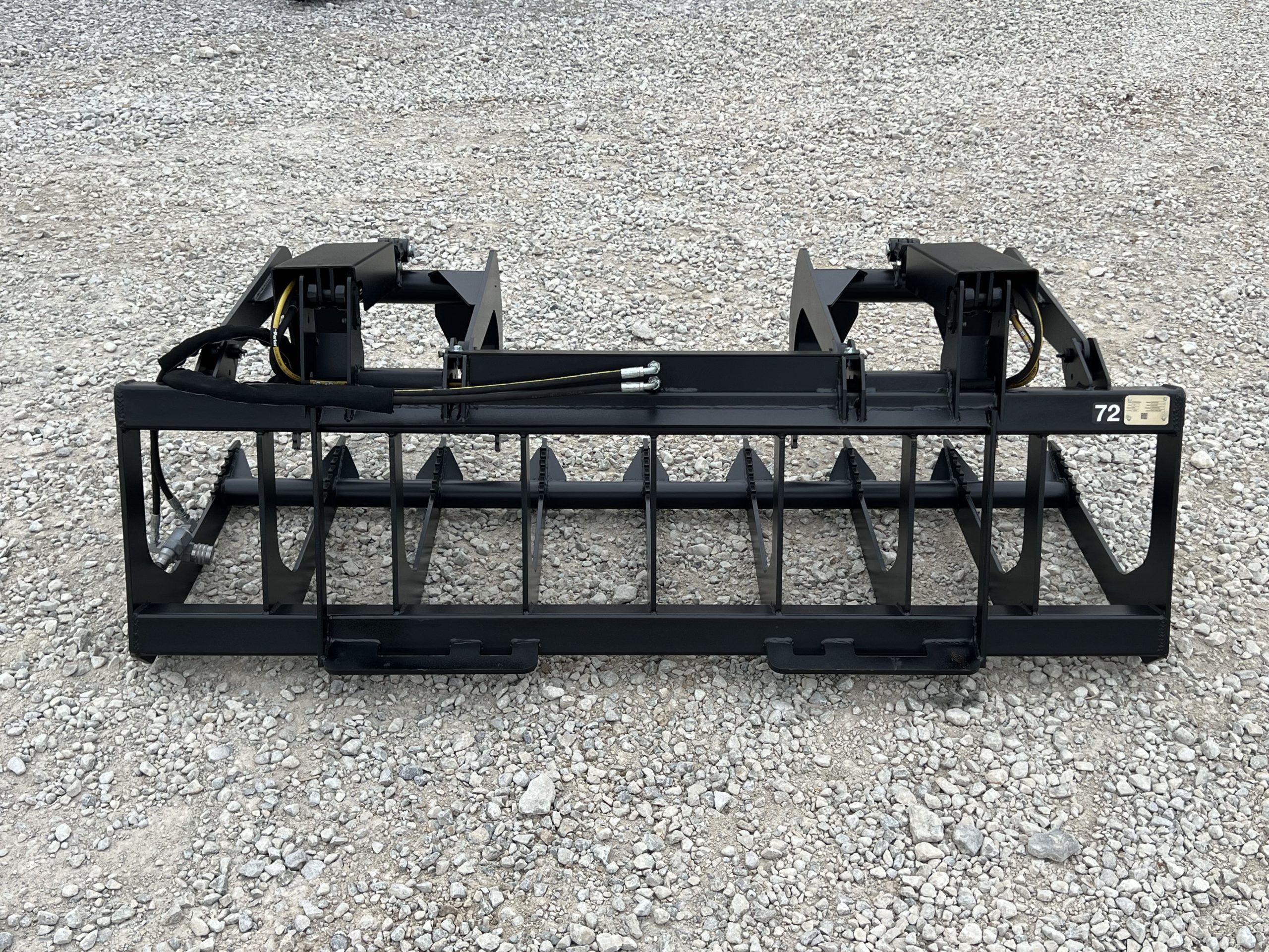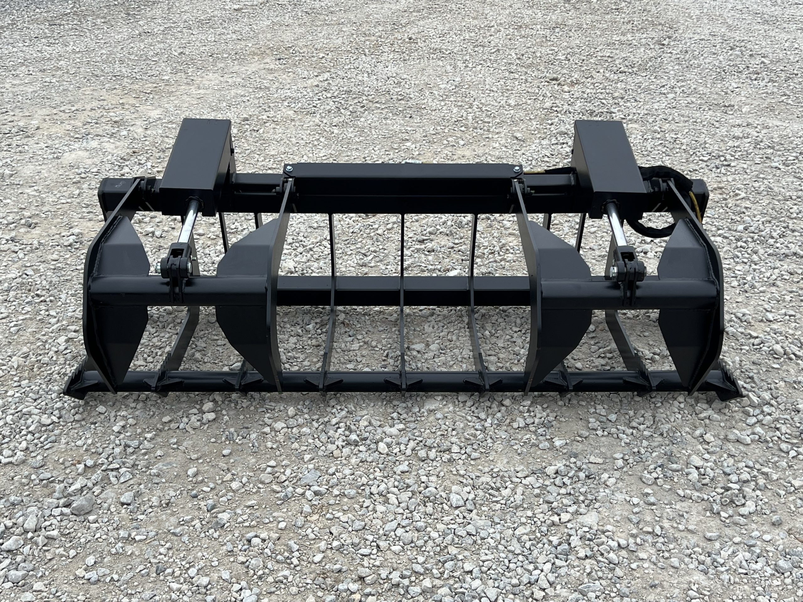 This is a brand new 72″ wide dual cylinder root grapple attachment with the skid steer style quick attach mounting system. This grapple model comes with grease fittings. With two independent grapple tines, you are able to grapple uneven loads. The open bottom design allows for dirt and smaller material to fall through. This model is rated for tractors and skid loaders with less than 45 horsepower.