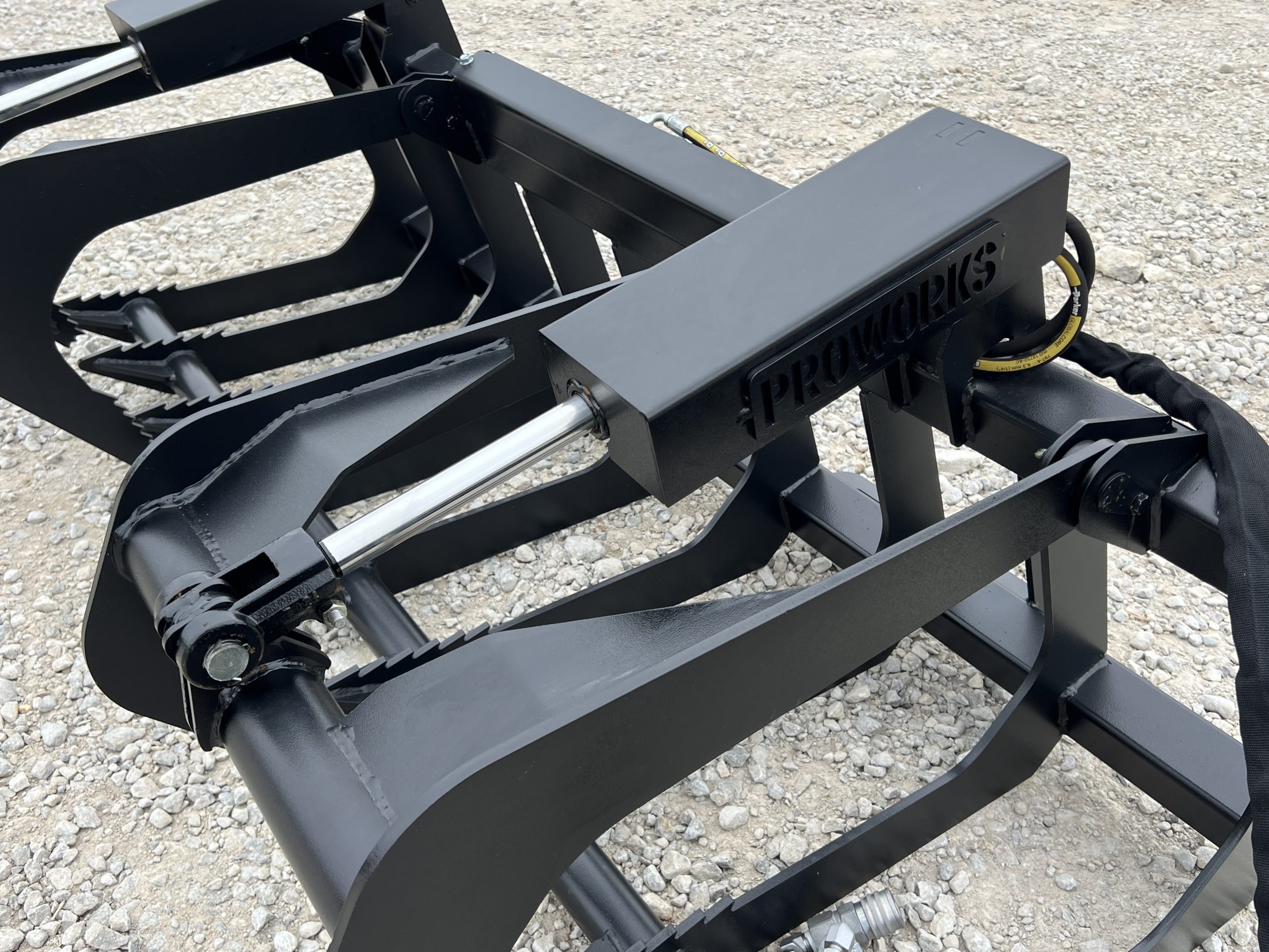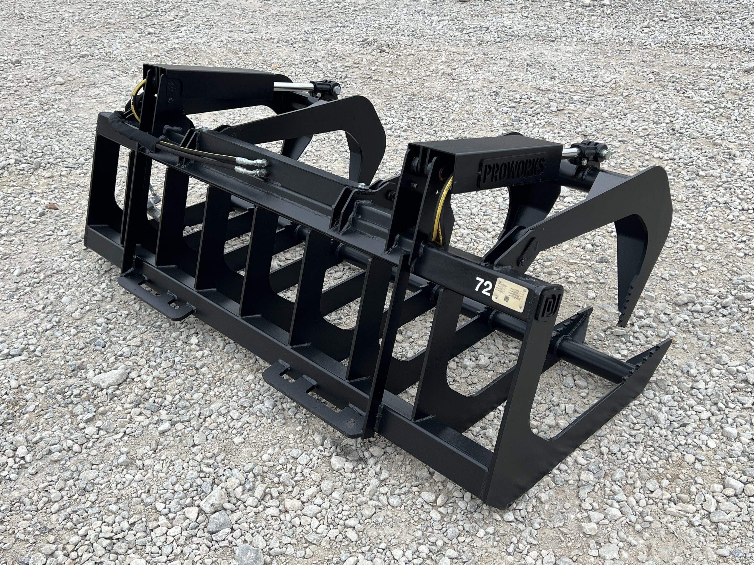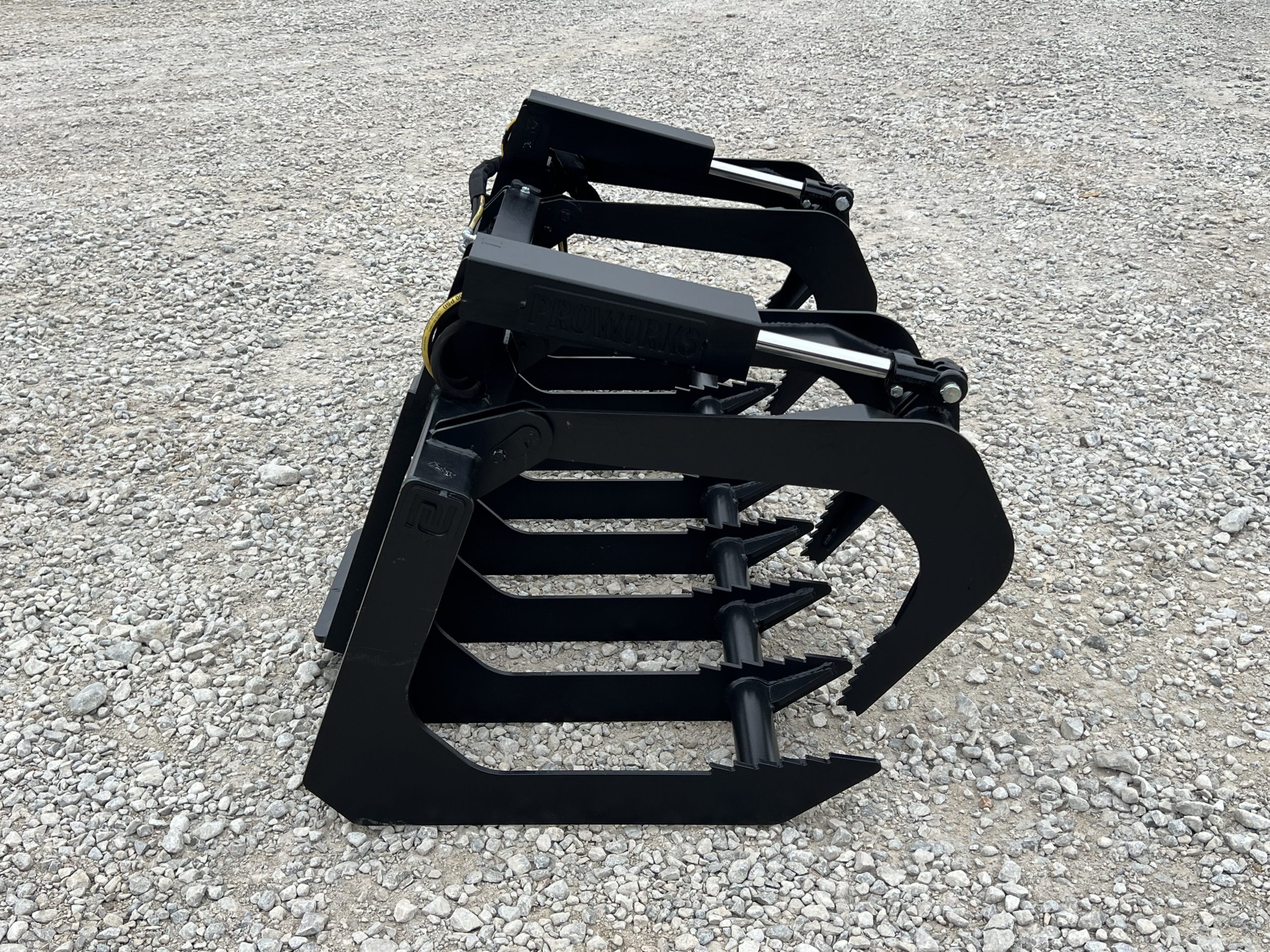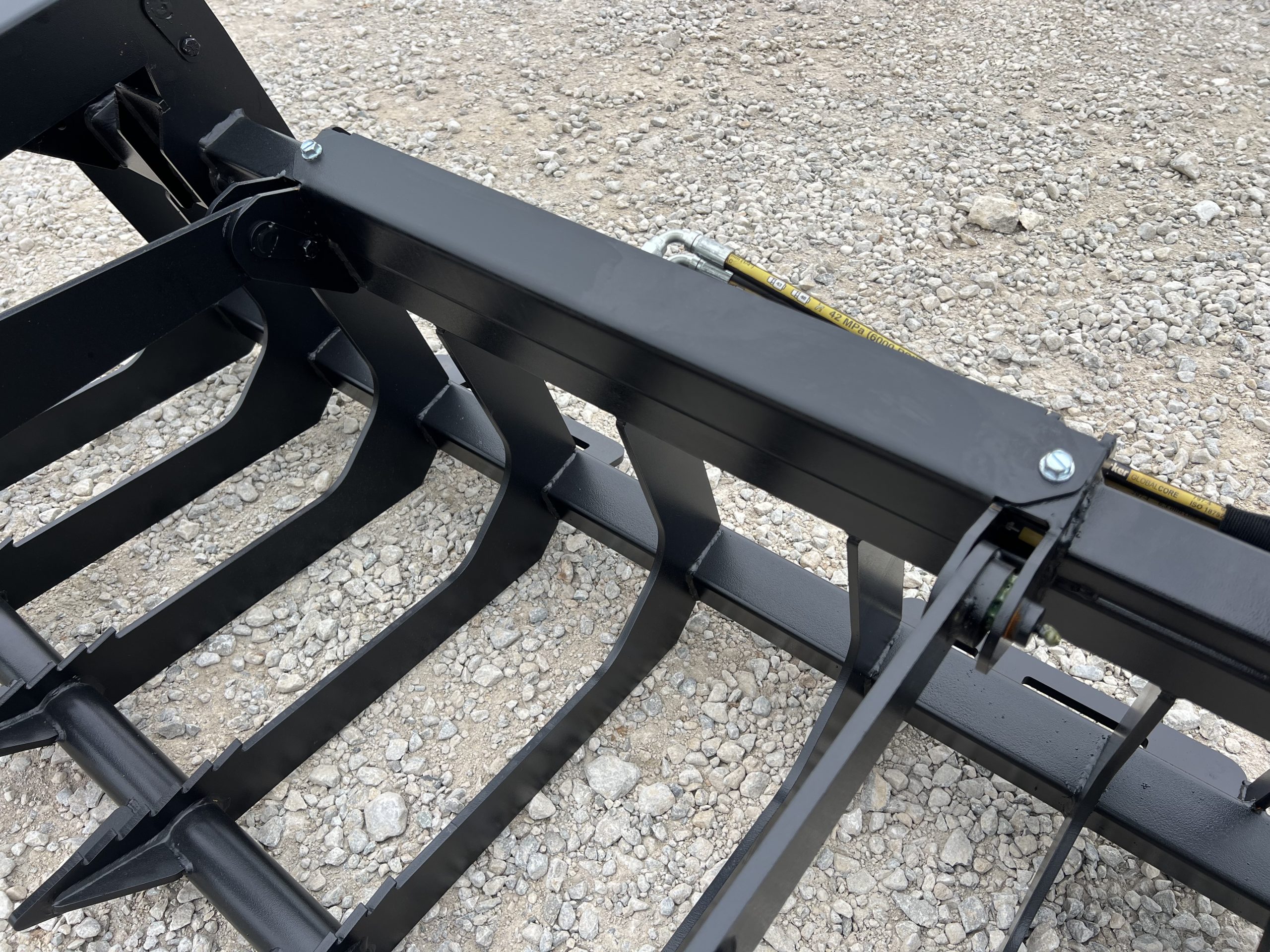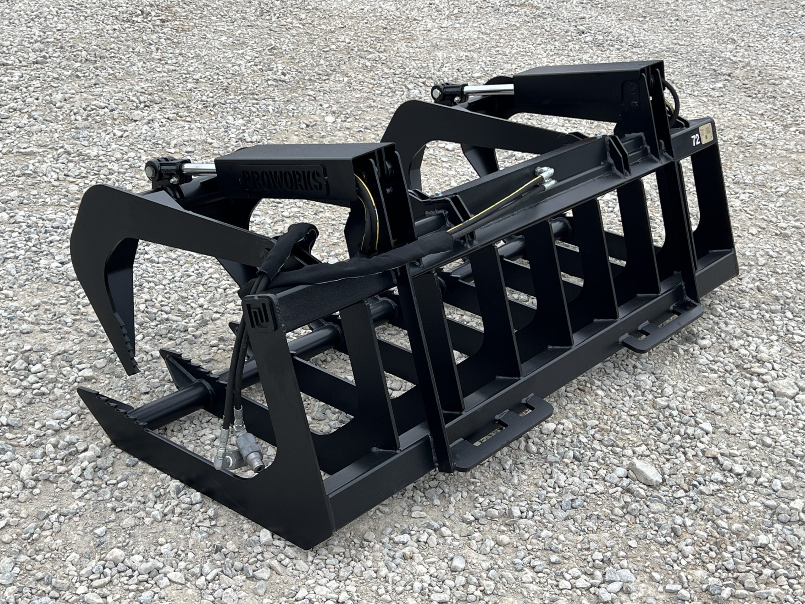 This is a brand new 72″ wide dual cylinder root grapple attachment with the skid steer style quick attach mounting system. This grapple model comes with grease fittings. With two independent grapple tines, you are able to grapple uneven loads. The open bottom design allows for dirt and smaller material to fall through. This model is rated for tractors and skid loaders with less than 45 horsepower.