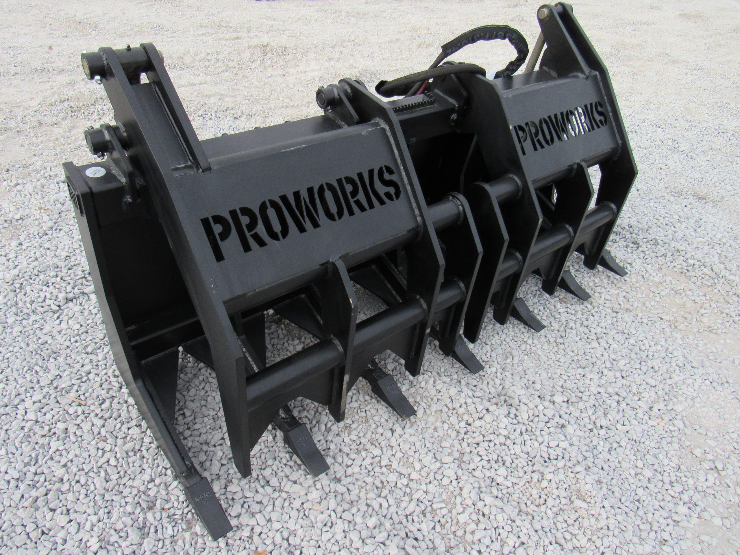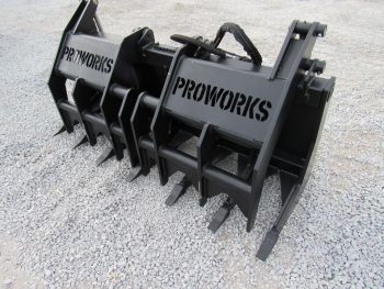 This is a brand new 72″ wide severe heavy duty root rake clam grapple attachment for sale. This particular model is built to be heavy duty for skid steers and farm tractors with more than 50 HP. This grapple has 3/4″ steel top tines and 1-1/2″ steel bottom tines. This grapple opens up 57″ wide and has very long tines equipped with teeth for digging and ripping roots up out of the soil. This model comes with greaseable hinge points and pins.