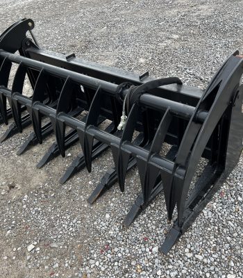 This is a 74” heavy duty root rake clam grapple with replaceable bucket teeth. This attachment is great for digging and ripping roots up out of the soil and will open up 50 inches. The top and bottom tines are made from 3/8” steel.