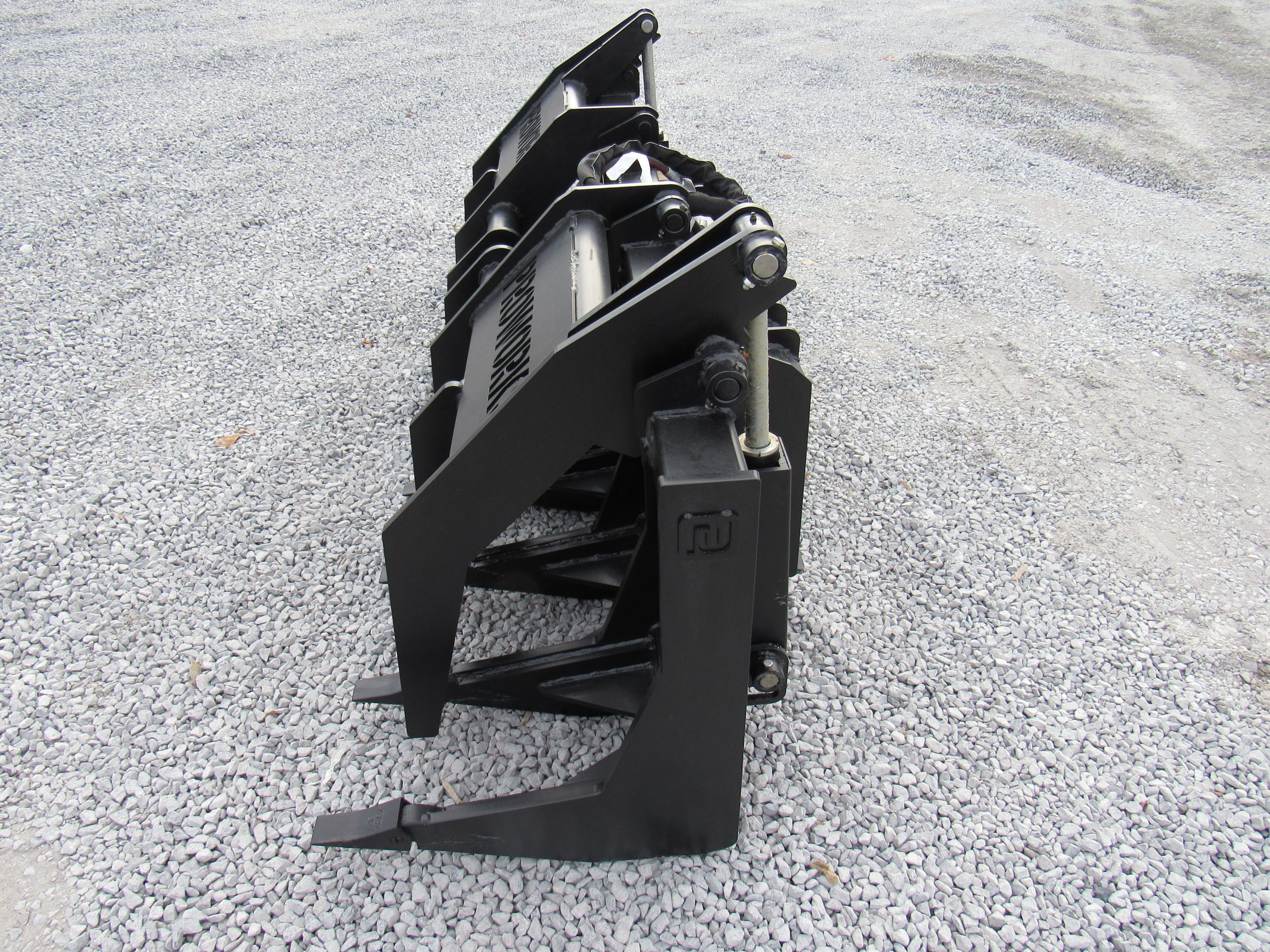 This is a brand new 84″ wide severe heavy duty root rake clam grapple attachment for sale. This particular model is built to be heavy duty for skid steers and farm tractors with more than 50 HP. This grapple has 3/4″ steel top tines and 1-1/2″ steel bottom tines. This grapple opens up 57″ wide and has very long tines equipped with teeth for digging and ripping roots up out of the soil. This model comes with greaseable hinge points and pins.