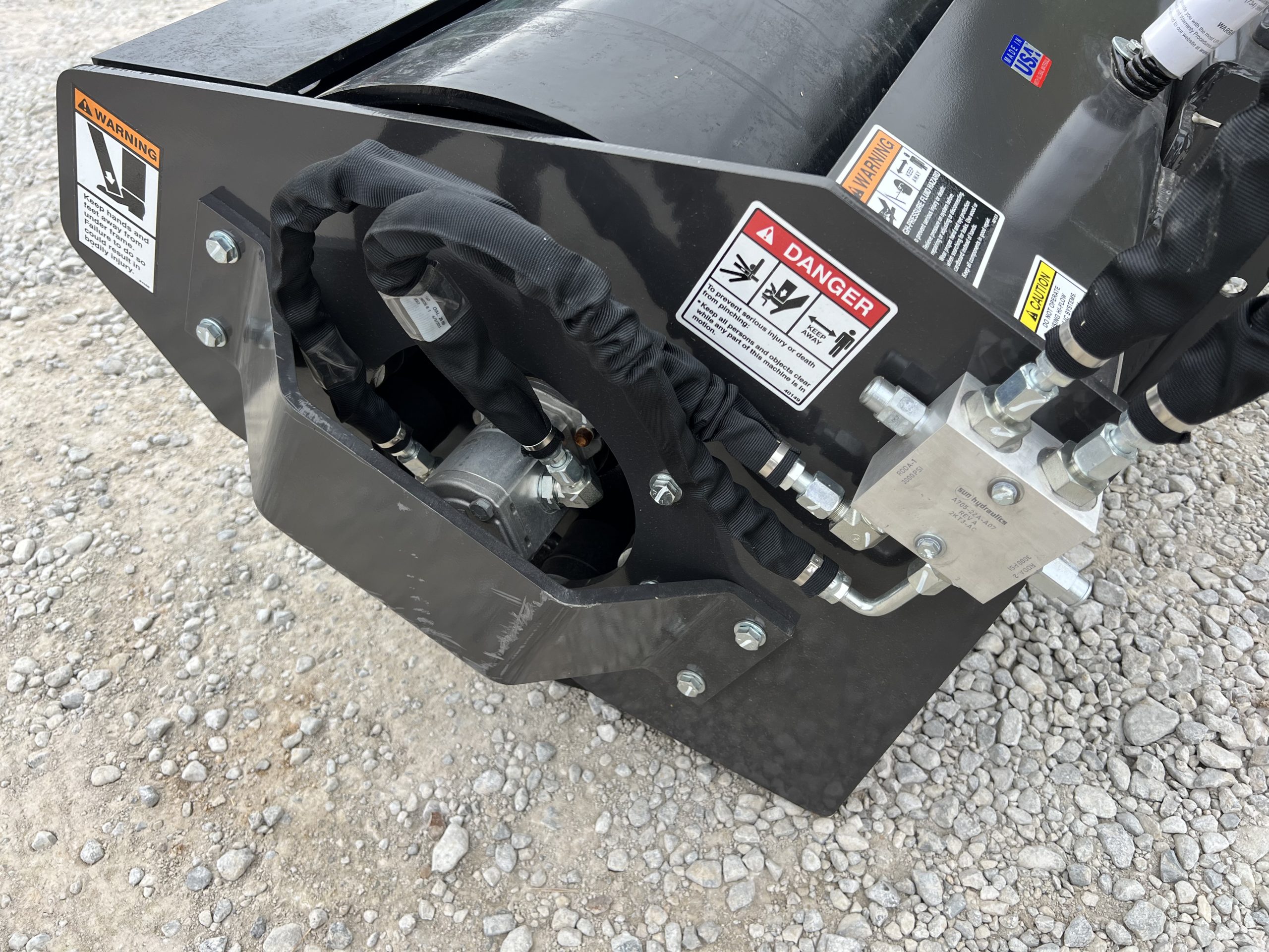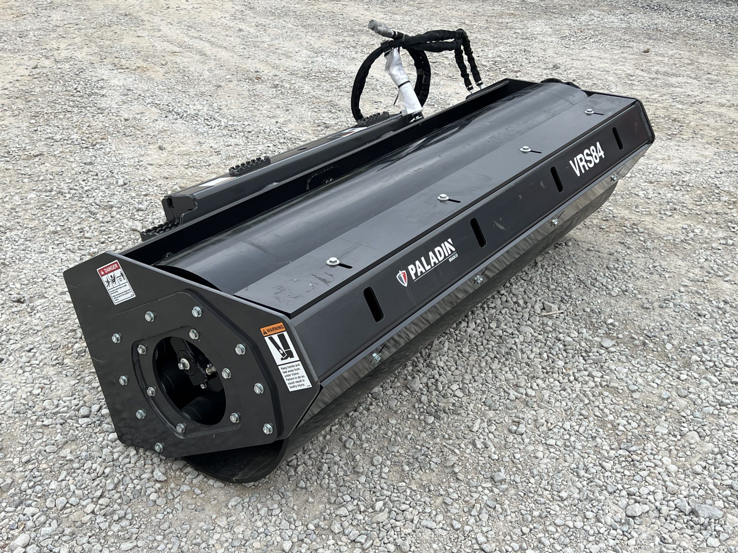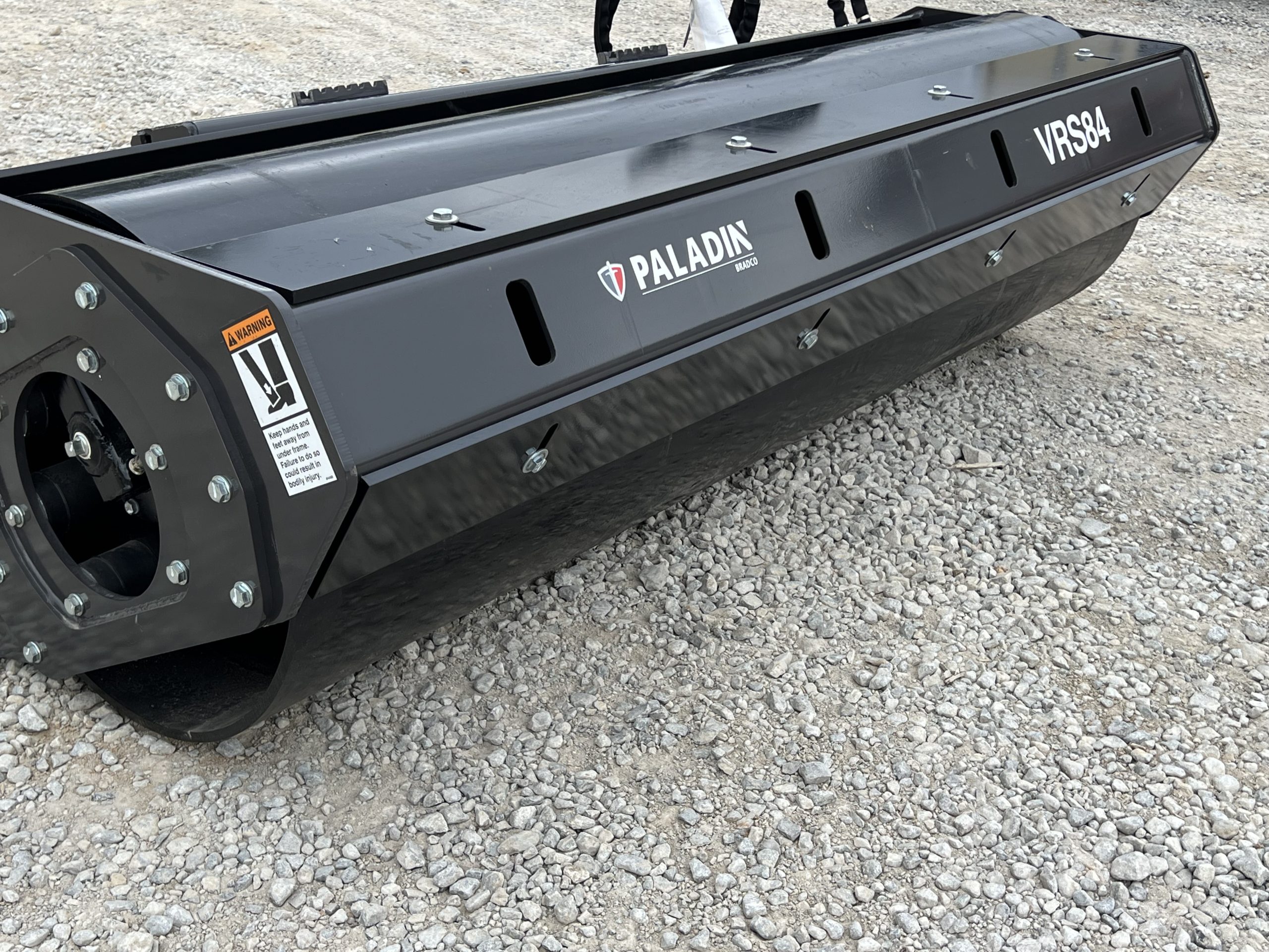 This is a brand new Paladin 84″ wide smooth drum vibratory roller attachment designed for skid steer loaders. Engineered for professional results, this Paladin roller delivers up to 9,370 lbs of dynamic force when operating at 20 GPM, making it ideal for demanding compaction jobs.