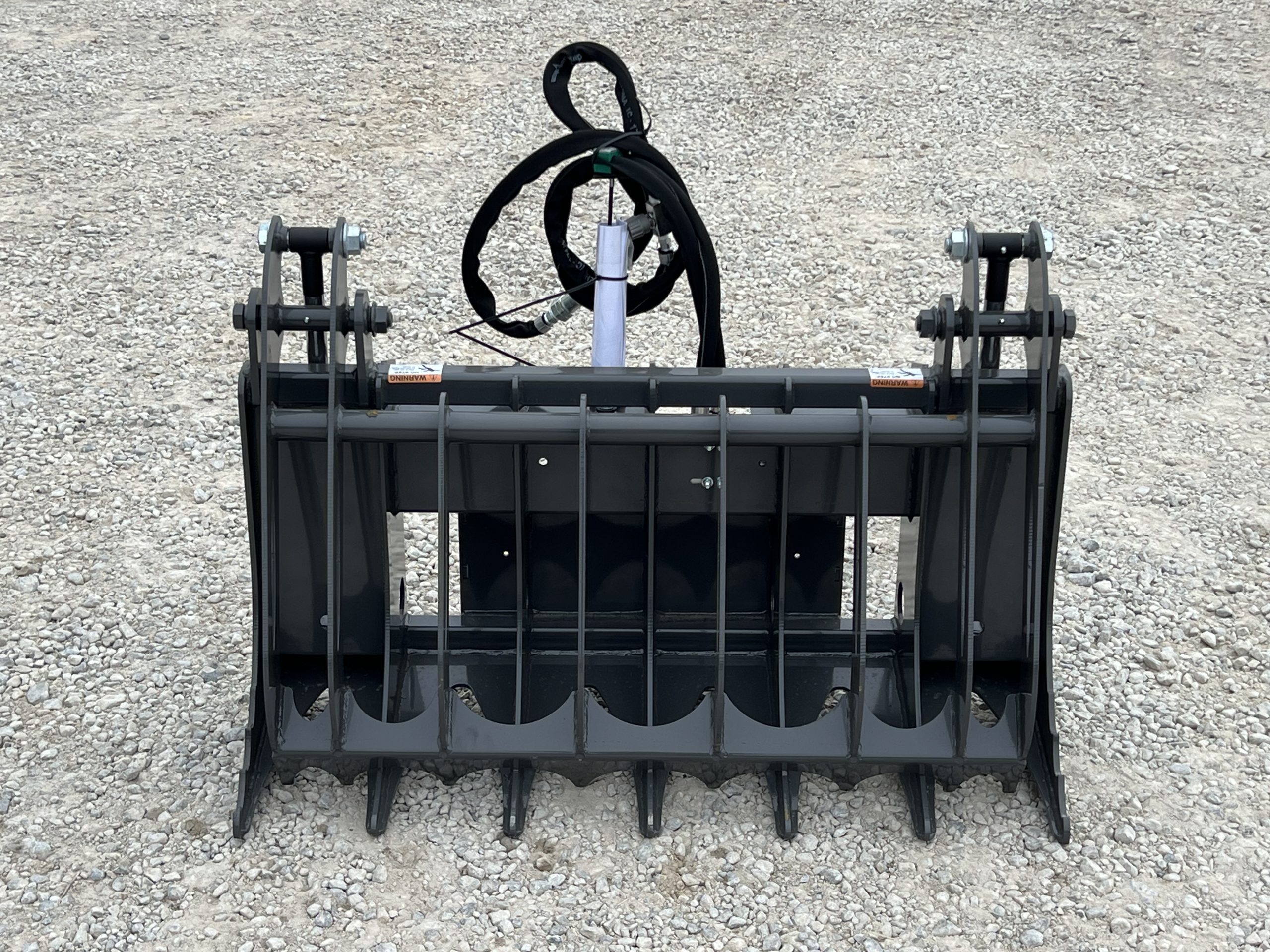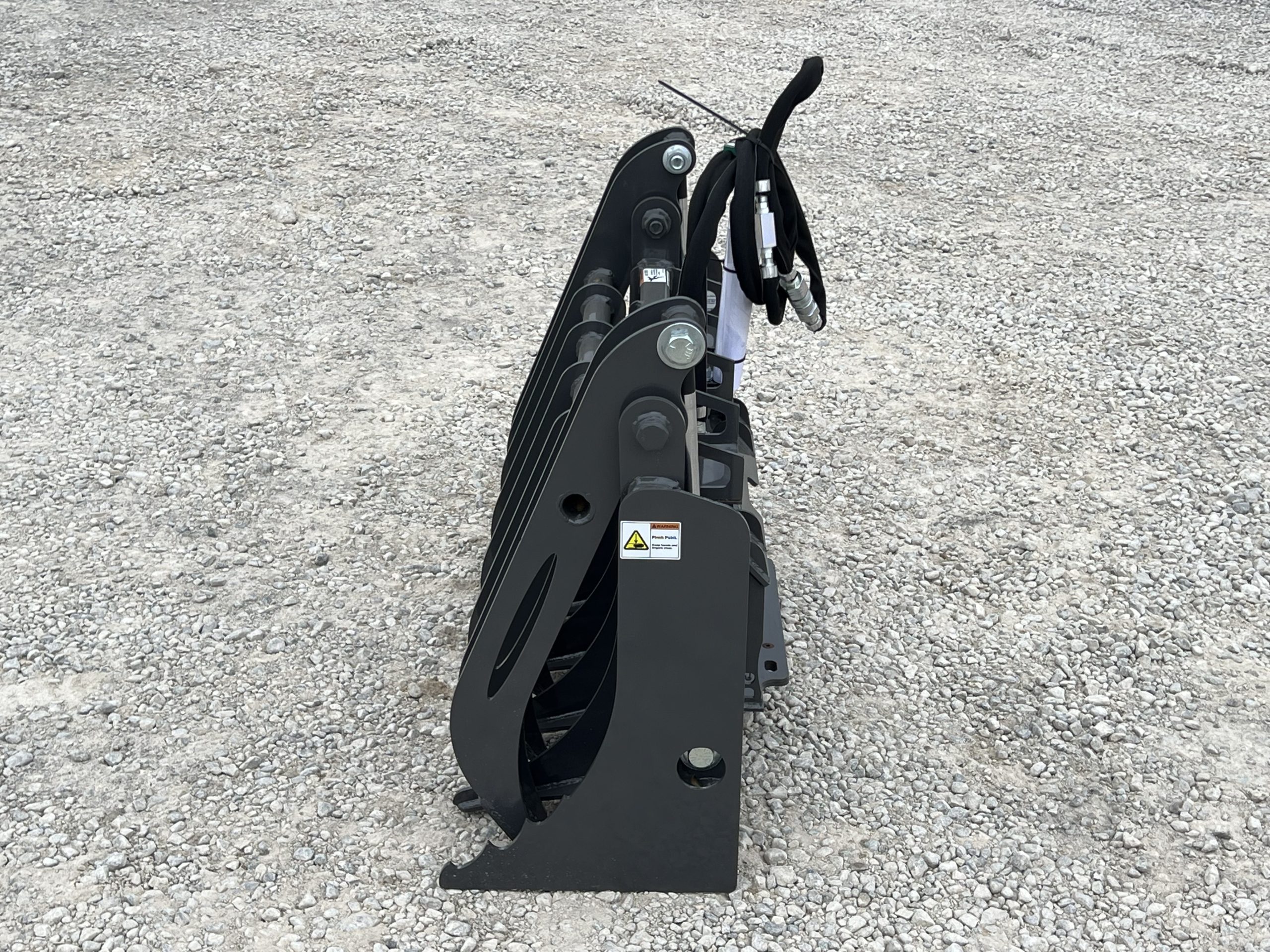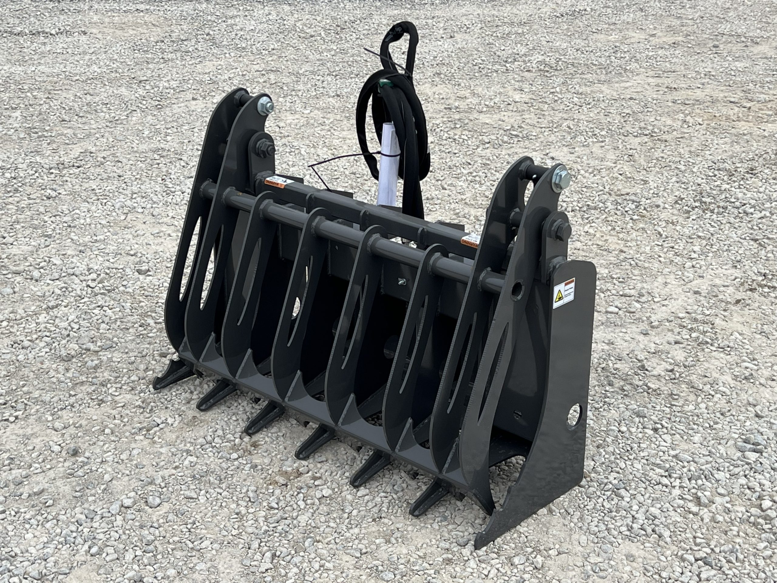 Built with durability and performance in mind, this grapple features rear-mounted hydraulic cylinders for maximum protection and increased claw opening capacity. The serrated end tines provide extra grip when handling uneven or bulky loads.