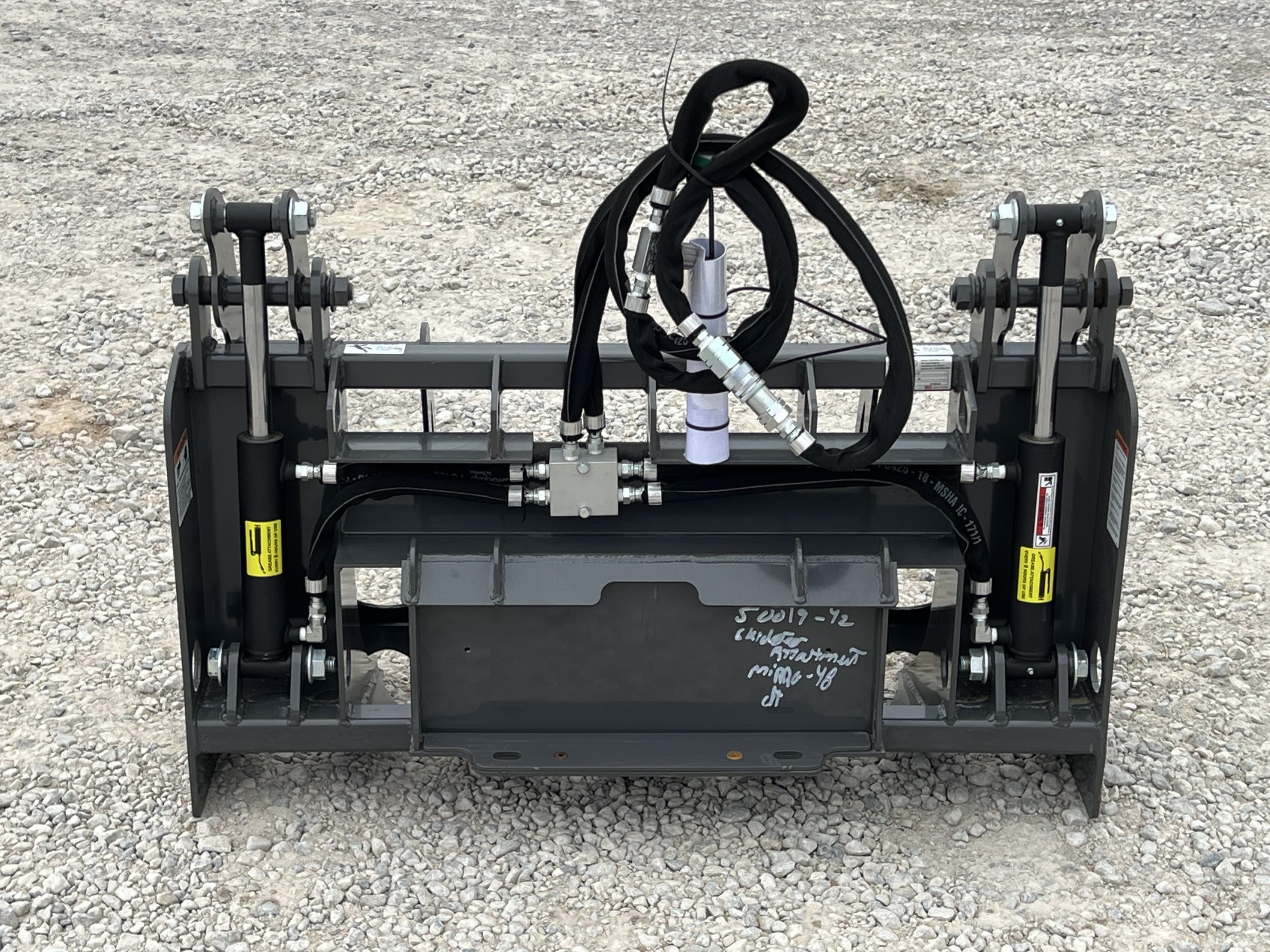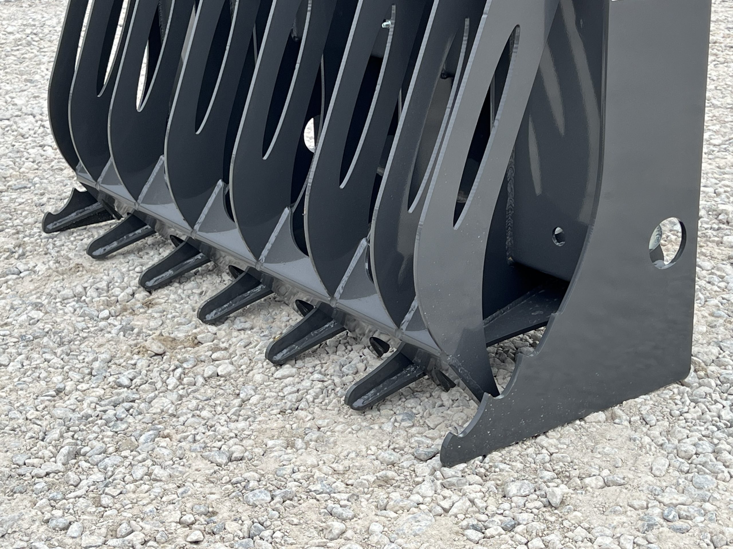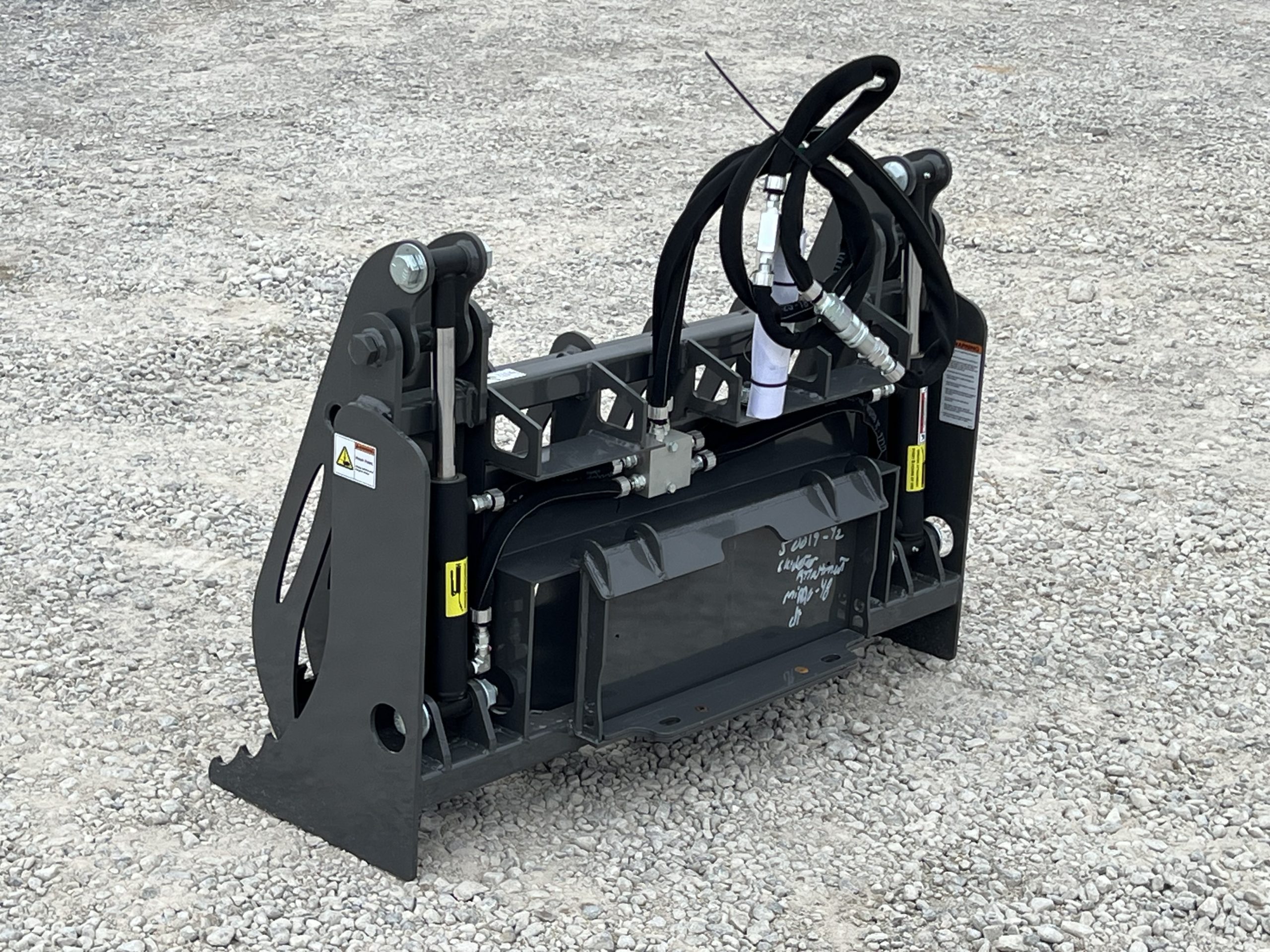 Built with durability and performance in mind, this grapple features rear-mounted hydraulic cylinders for maximum protection and increased claw opening capacity. The serrated end tines provide extra grip when handling uneven or bulky loads.