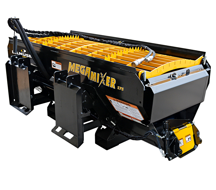 This is a new Danuser model S75 (Newest Model!) Mega Mixer for sale. This tool is exceptional for mixing concrete, livestock feed, mortar, grout, asphalt, wet sand, dry sand, 1″ clean, 1″ rock, dry topsoil, sawdust, compost, and manure! You can mix, scoop, and dispense a wide variety of materials with ease. With adjustable mounting brackets and pallet fork tine slots on both sides, conveniently dispense left or right. Built-in cutting edges and a robust design make it well-suited for scooping from piles. This package comes standard with dual safety grates that feature a serrated edge for busting open bags. The Mega Mixer includes two 2′ multi-link chutes that store on each side of the bucket. A closable discharge end limits spilling and allows for faster material mixing. With features like chute storage, pin holders, easy-to-read yardage markers, a robust 8″ diameter auger coupled directly to a heavy-duty, low-speed, high-torque motor capable of dispensing 3/4 yard of material in 26 seconds (up to 1″ diameter rock), this product will allow you to save a lot of time and labor.
