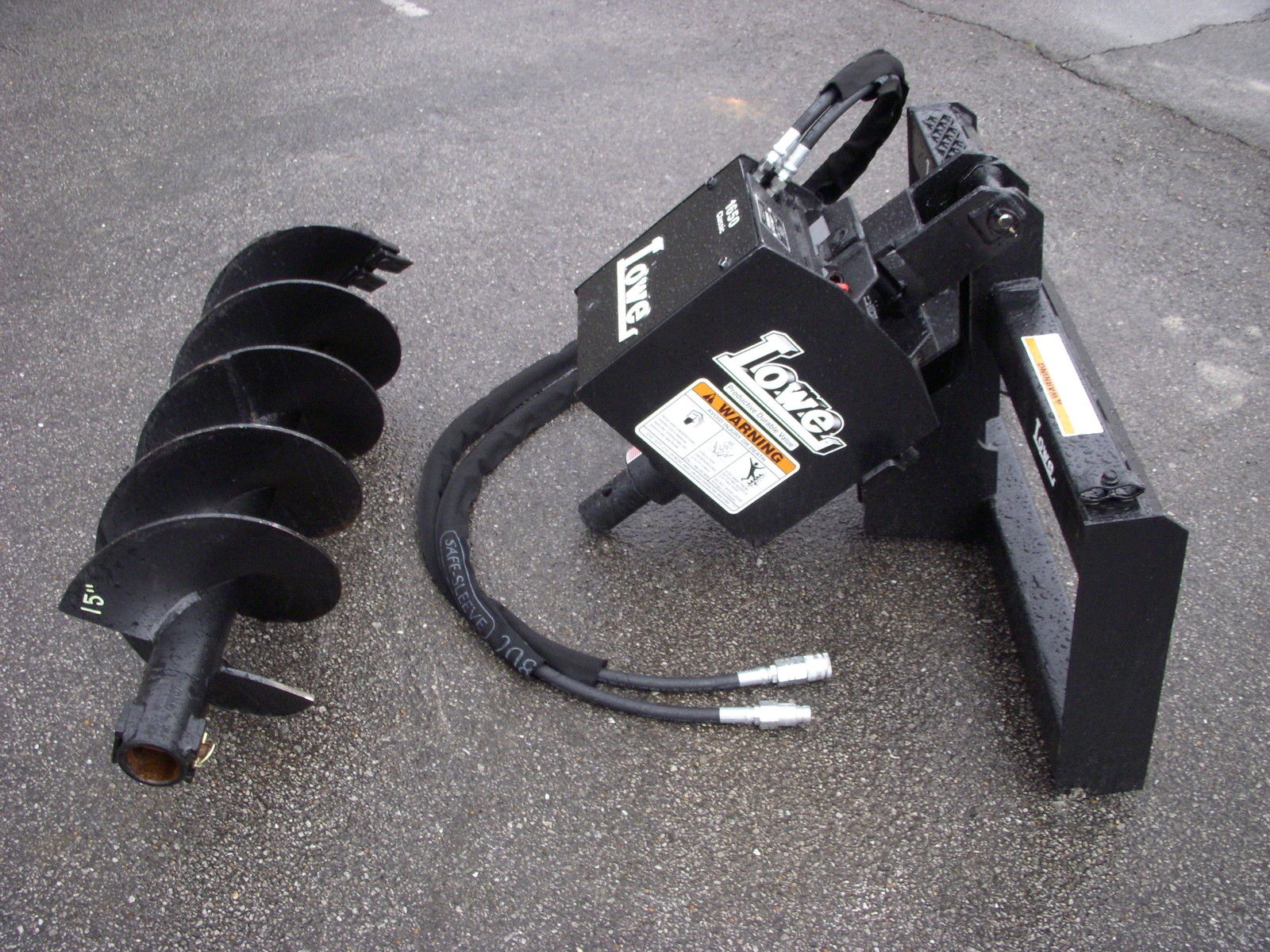 This a new Lowe 1650 Classic auger drive post hole digger packaged with a 4′ tall by 15″ wide auger bit. This package is designed to be run a skid steer loader with the universal skid steer mounting system. The 1650 Classic is a high speed/low torque design that is rated up to a 36″ wide auger bit. This model features an ultra reliable Lowe brand hydraulic motor, solid unit structures, heat treated alloy shafts, and an even heavier duty chain reduction drive! This is the most popular drive unit by Lowe manufacturing. These units are tried and true and have been working in the field since the 1970’s!