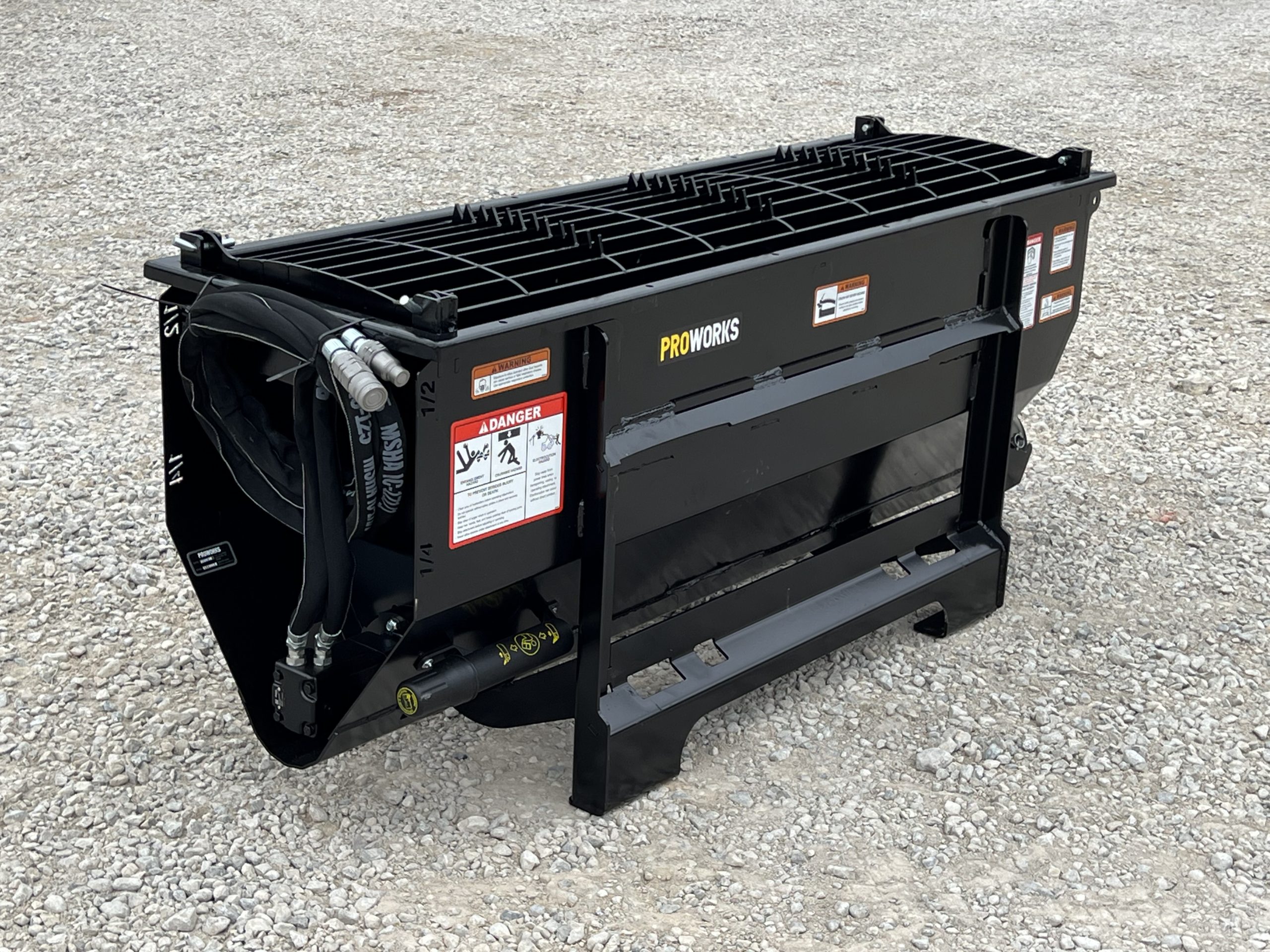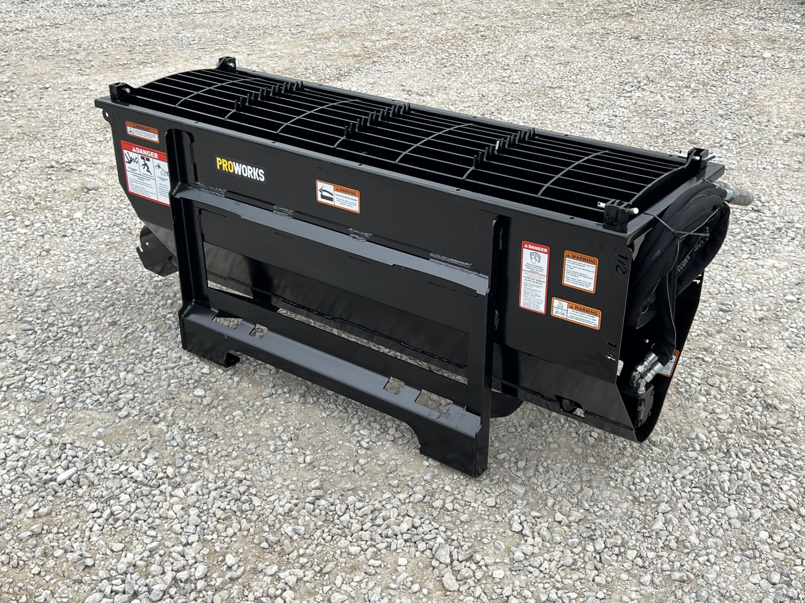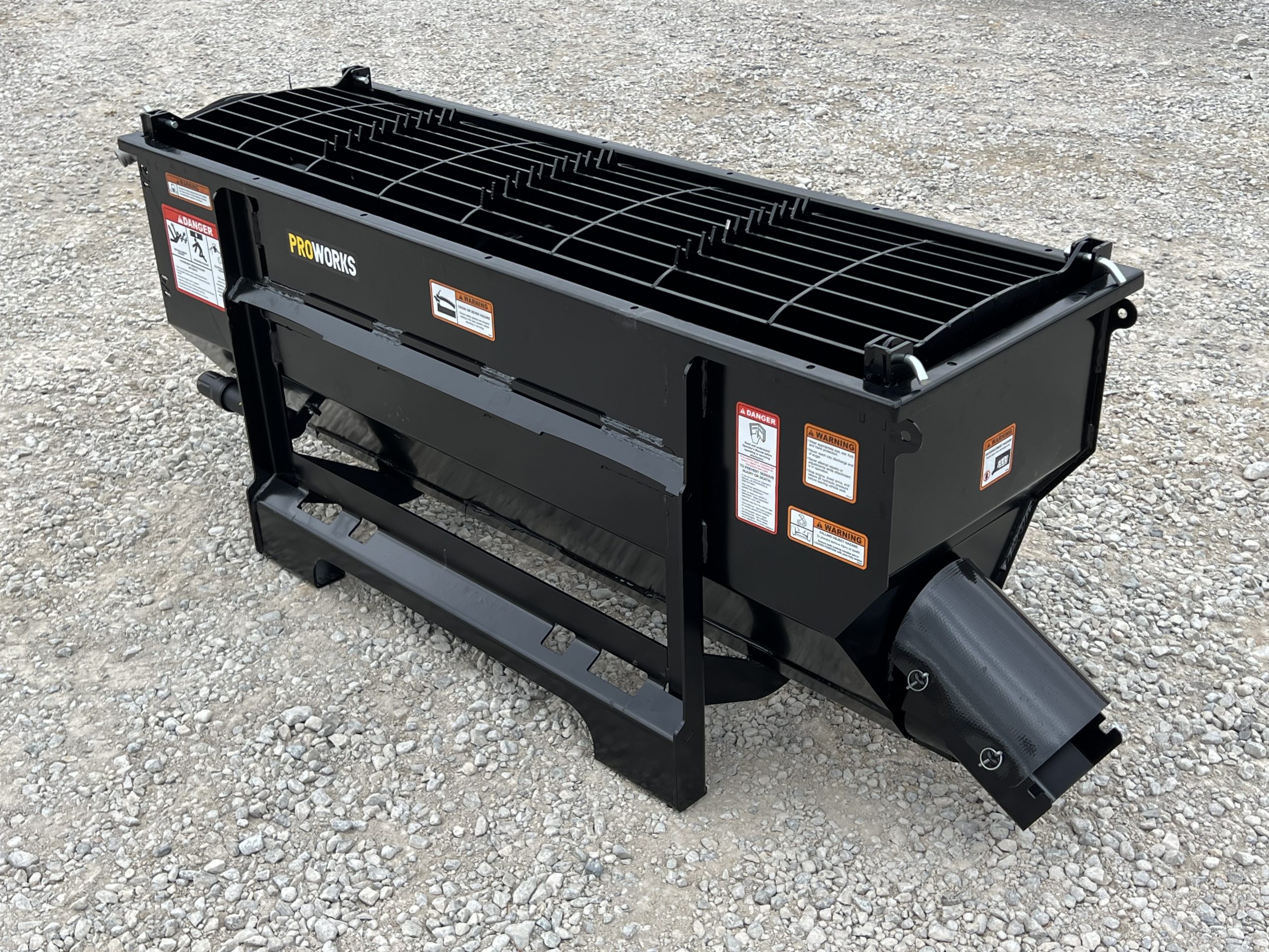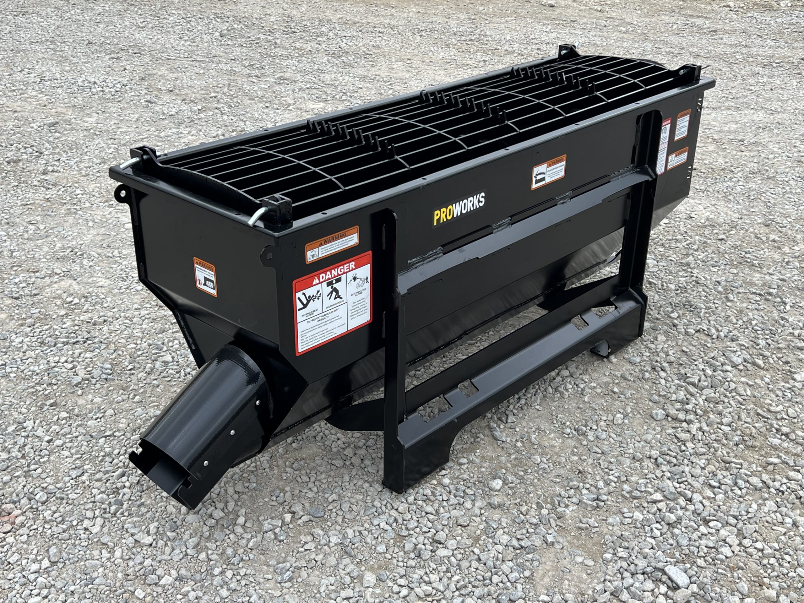 This is a new PROWorks MX0050 Auger Bucket. This tool is exceptional for mixing concrete, livestock feed, mortar, grout, asphalt, wet sand, dry sand, 1″ clean, 1″ rock, dry topsoil, sawdust, compost, and manure! You can mix, scoop, and dispense a wide variety of materials with ease. With dual mounting brackets conveniently dispense left or right. This package comes standard with dual safety grates that feature a serrated edge for busting open bags. The Mega Mixer includes two 2′ multi-link chutes. A closable discharge end limits spilling and allows for faster material mixing. With features like chute storage, pin holders, easy-to-read yardage markers and a high-torque motor with 1/2 yard capacity.