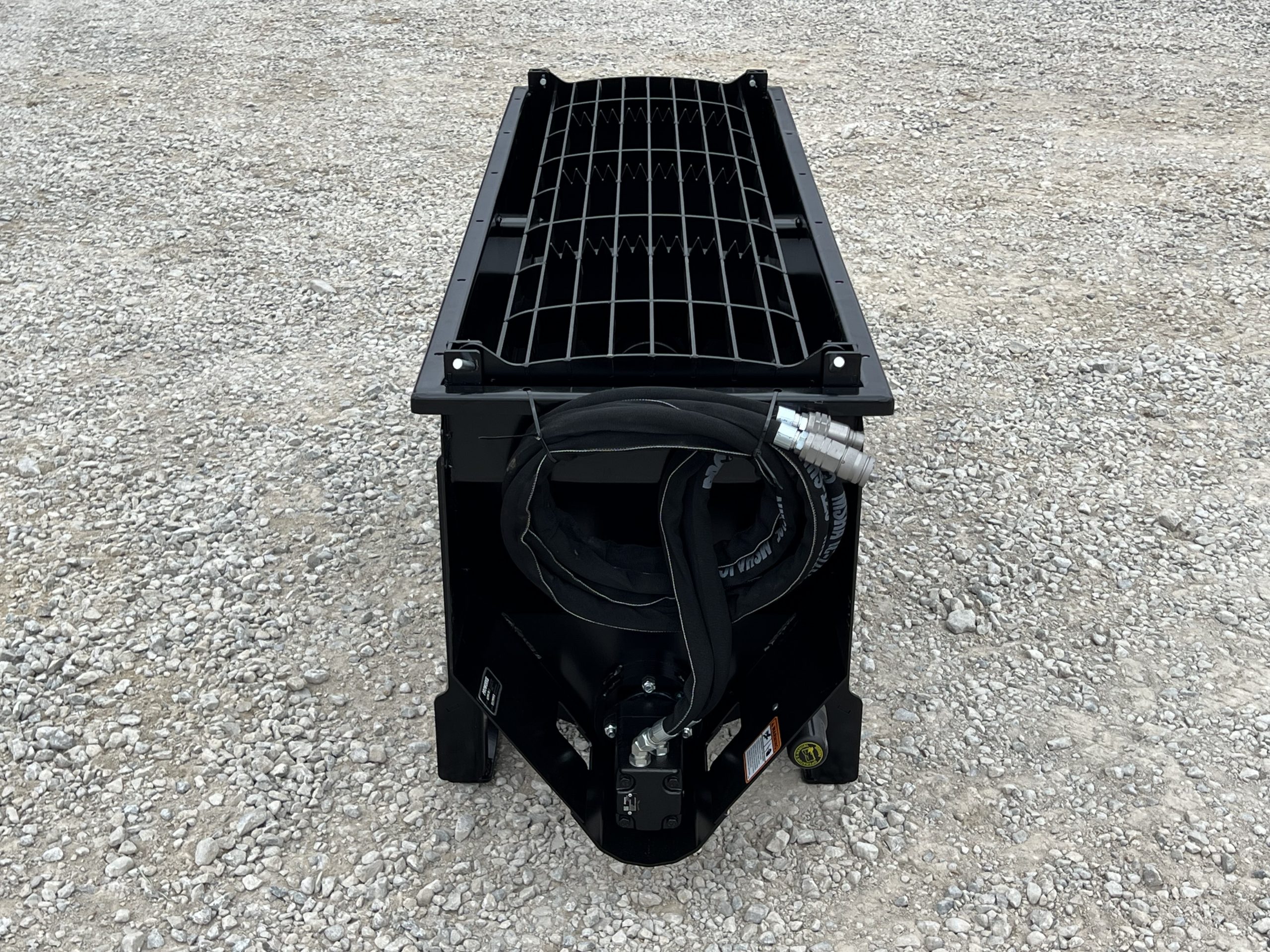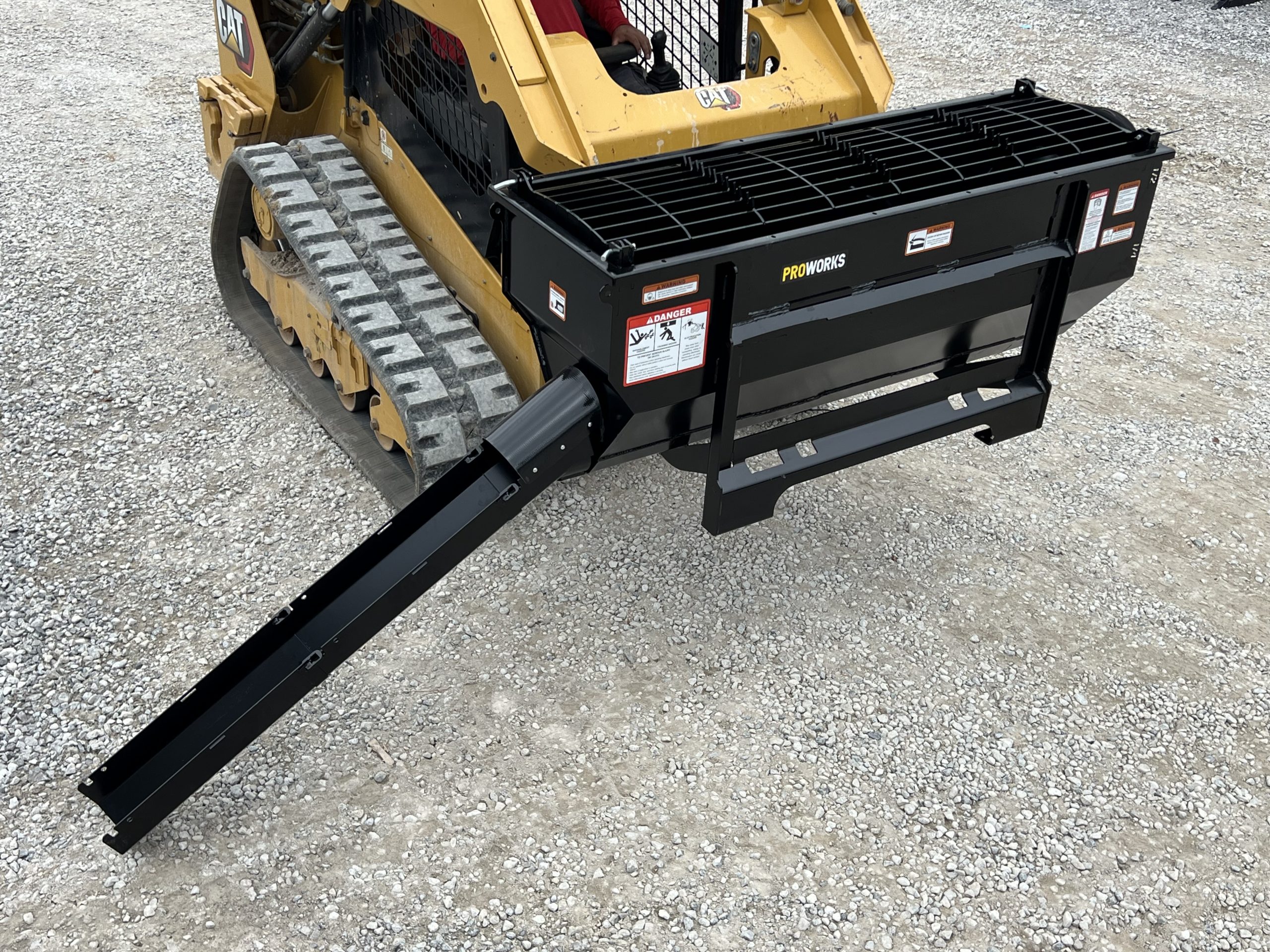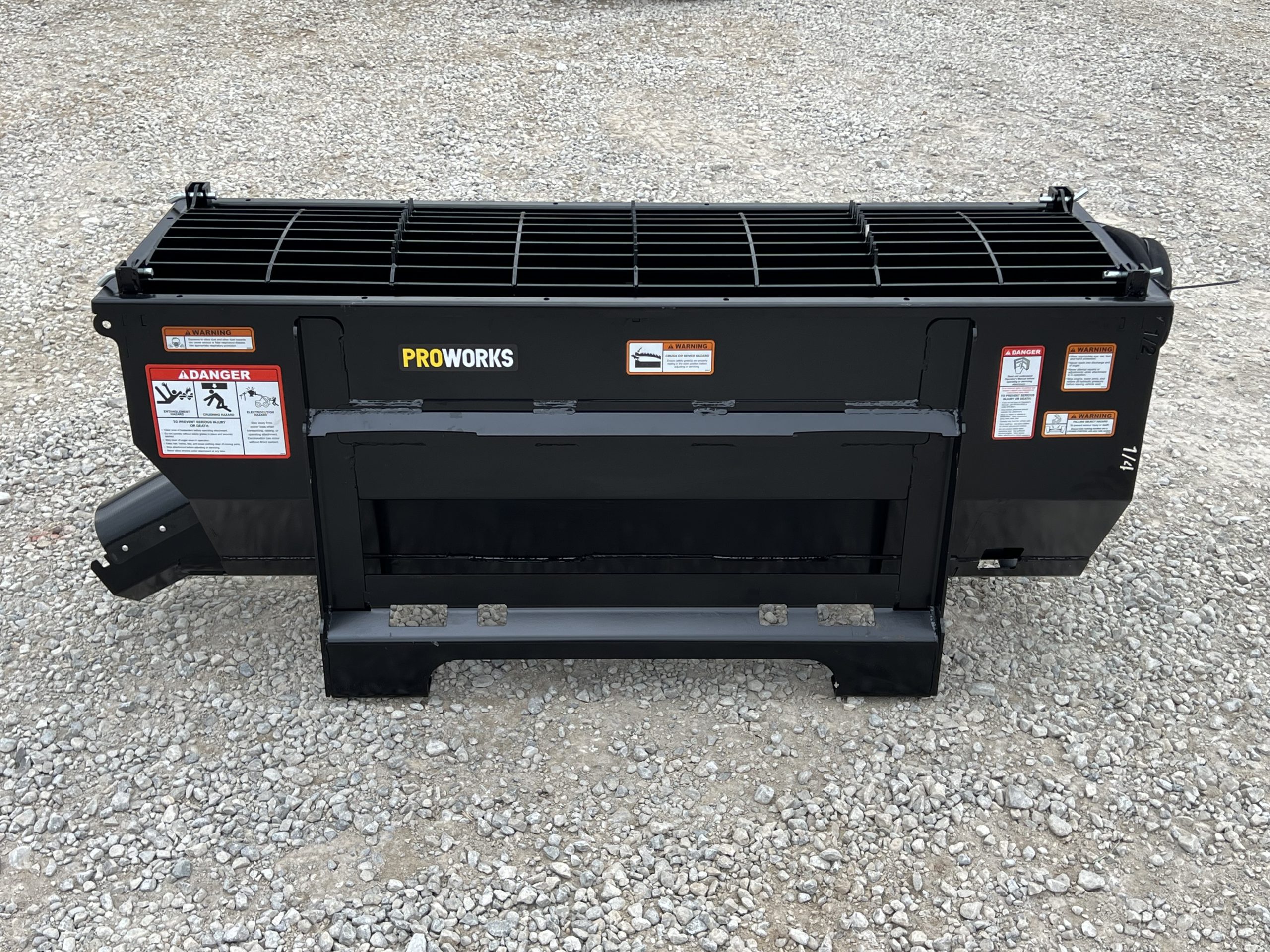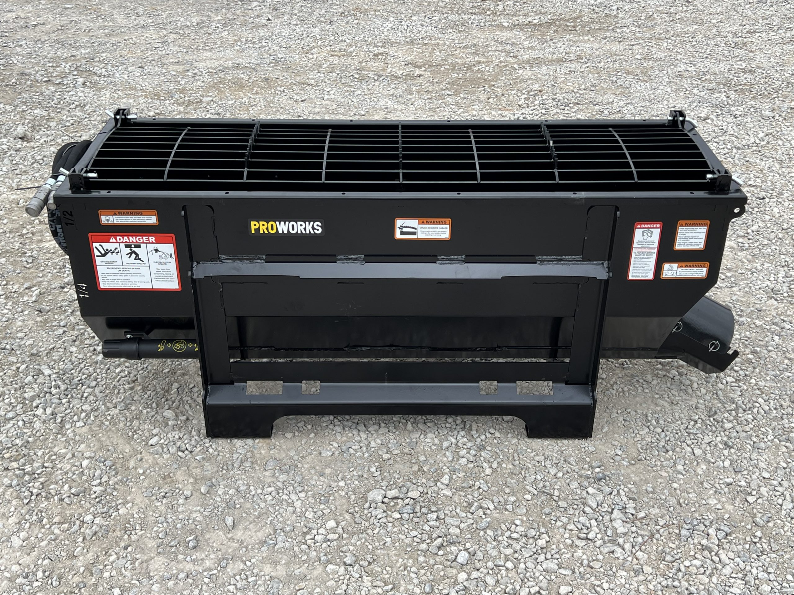 This is a new PROWorks MX0050 Auger Bucket. This tool is exceptional for mixing concrete, livestock feed, mortar, grout, asphalt, wet sand, dry sand, 1″ clean, 1″ rock, dry topsoil, sawdust, compost, and manure! You can mix, scoop, and dispense a wide variety of materials with ease. With dual mounting brackets conveniently dispense left or right. This package comes standard with dual safety grates that feature a serrated edge for busting open bags. The Mega Mixer includes two 2′ multi-link chutes. A closable discharge end limits spilling and allows for faster material mixing. With features like chute storage, pin holders, easy-to-read yardage markers and a high-torque motor with 1/2 yard capacity.