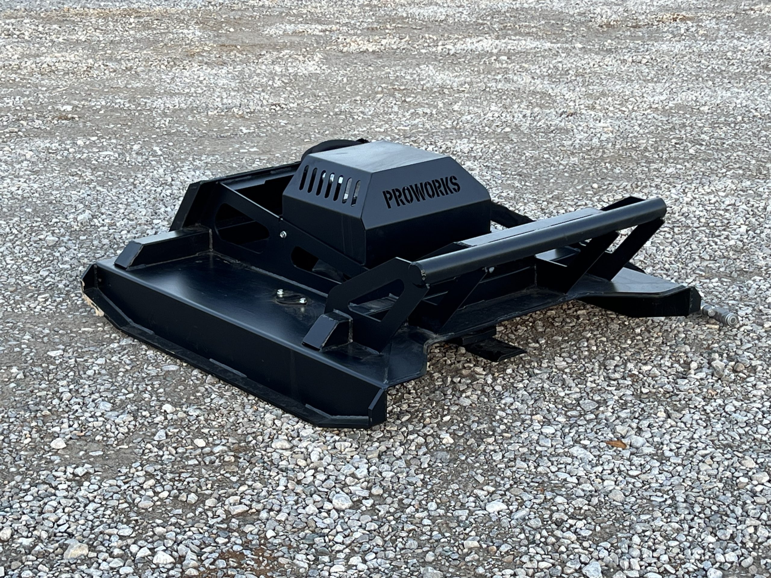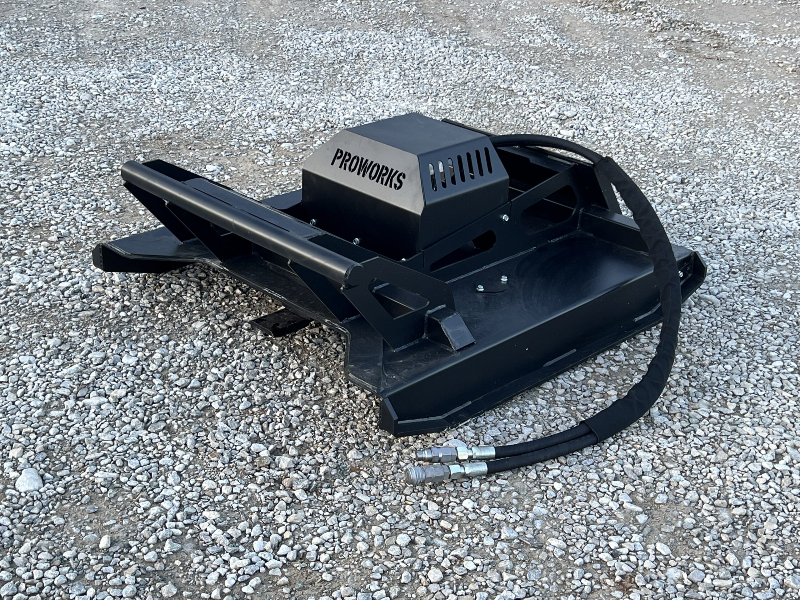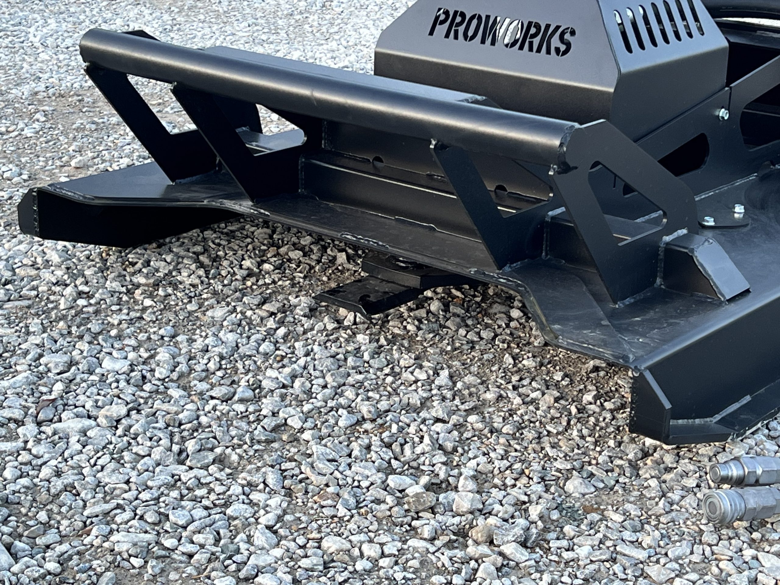 This is a new PROWORKS 42″ open front brush cutter (rotary mower), proudly made in the USA, designed for mini skid steers with the mini universal mounting system. This model features an open front cutting design with a built-in push bar, allowing material to be pushed forward into the blades for more aggressive, efficient cutting of brush and grass.