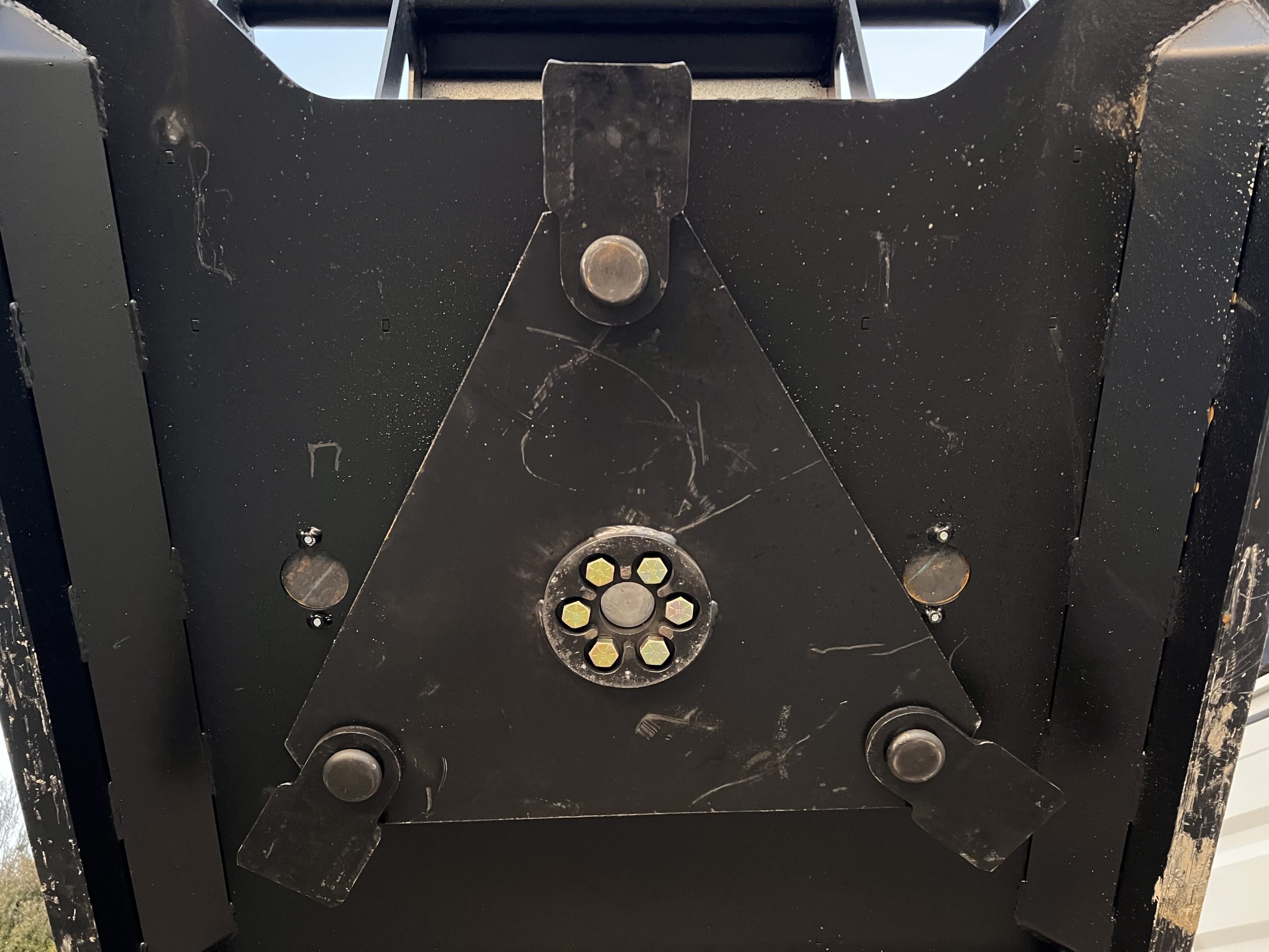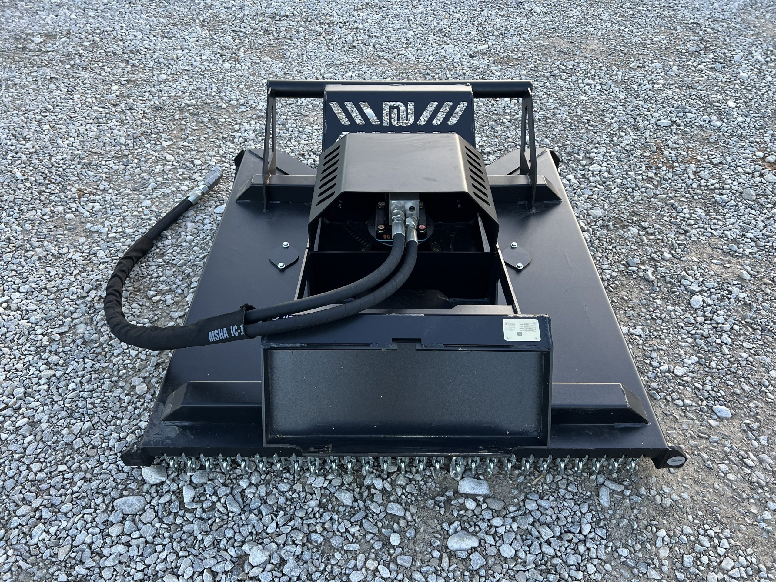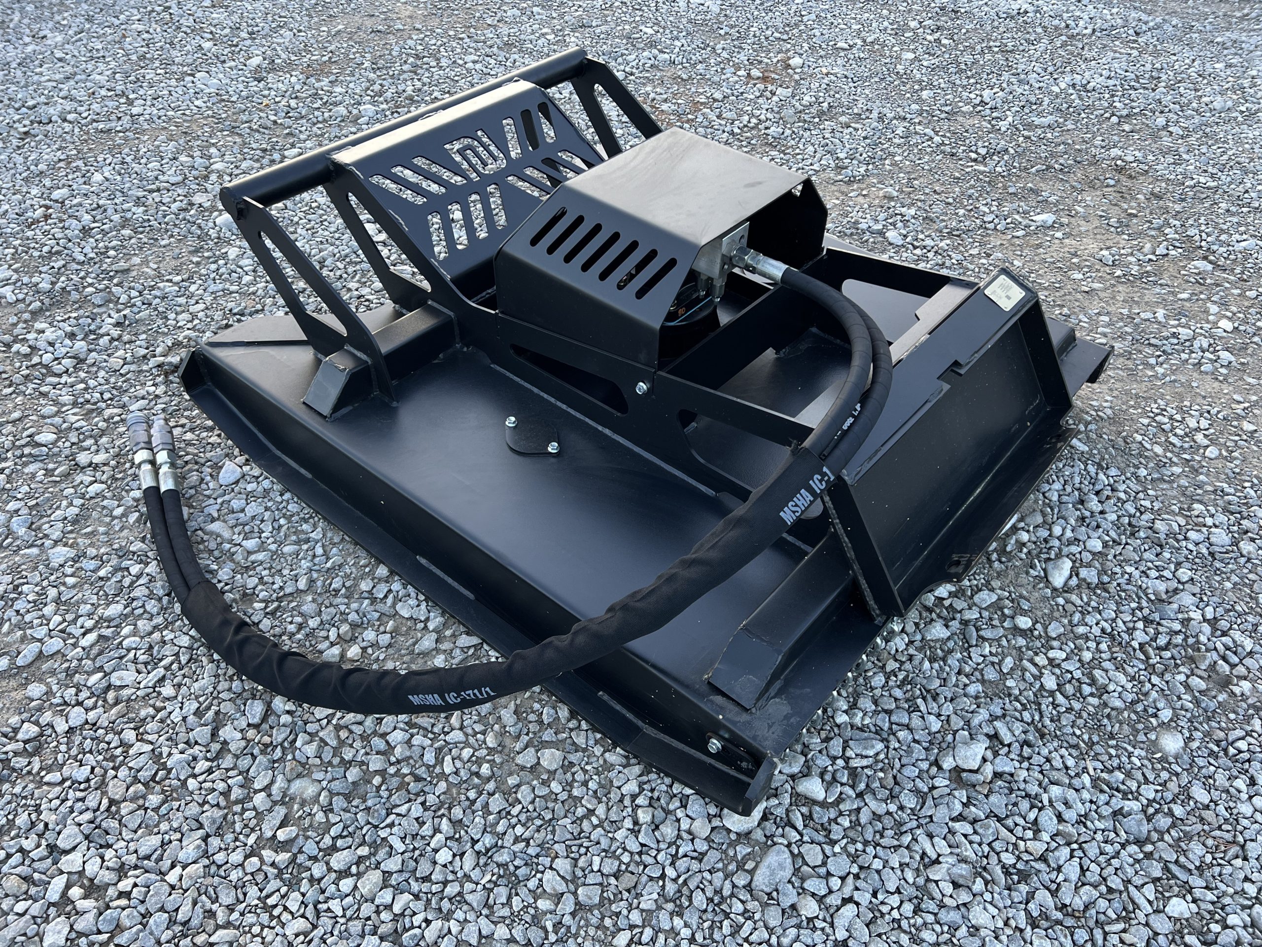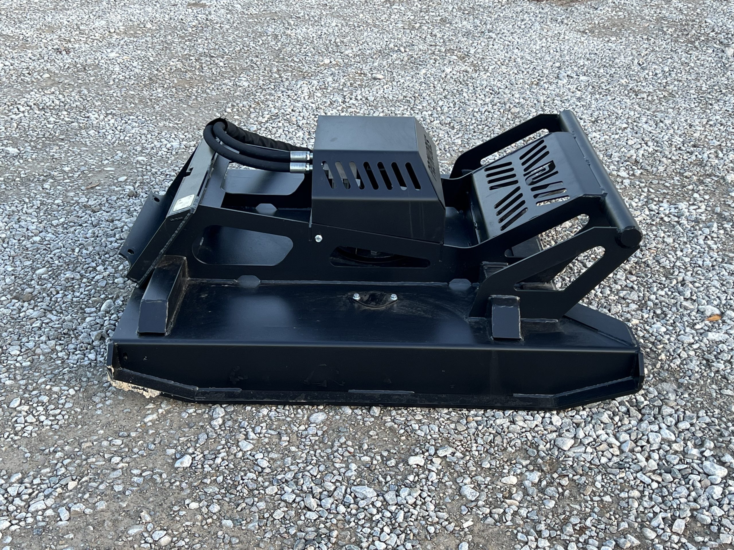 This is a new PROWORKS 42″ open front brush cutter (rotary mower), proudly made in the USA, designed for mini skid steers with the mini universal mounting system. This model features an open front cutting design with a built-in push bar, allowing material to be pushed forward into the blades for more aggressive, efficient cutting of brush and grass.