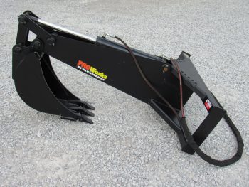 This is a new backhoe attachment designed for a full size skid steer wheel or track loader. This model features a 12″ wide trench bucket with 230 style cast teeth. The backhoe attachment makes digging trenches a breeze with your skid steer. The attachment features a 3-1/2″ bore x 20″ long stroke creating a great amount of digging force. When the bucket is fully extended the overall length is 96″ and it can dig at a depth of 72″.